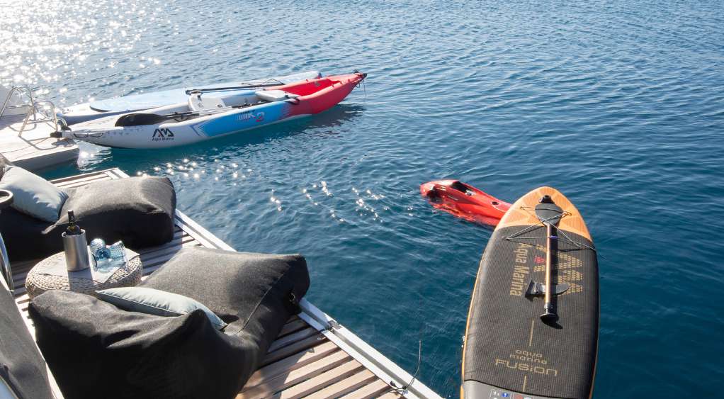 Tenders & Toys: • T/T Highfield Delux 4.6m tender with 60HP outdoor motor • 2 x Seabob • Standup Paddle boards • Kayak • Wakeboard (adults) • Water ski (adults and children) • Fishing Equipment • Snorkelling equipment • Tubes - Towable inflatable /// Audio Visual Equipment and Deck Facilities: • Amenities • Air conditioning • Watermaker • Icemaker • Electric heads • Generator • Inverter • B&W Hi-Fi system linked to cockpit , saloon and flybridge B&W speakers • TV in the saloon • Fans in salon and cabins • WiFi connection on board • Teak Deck • Nespresso Professional Coffee machine