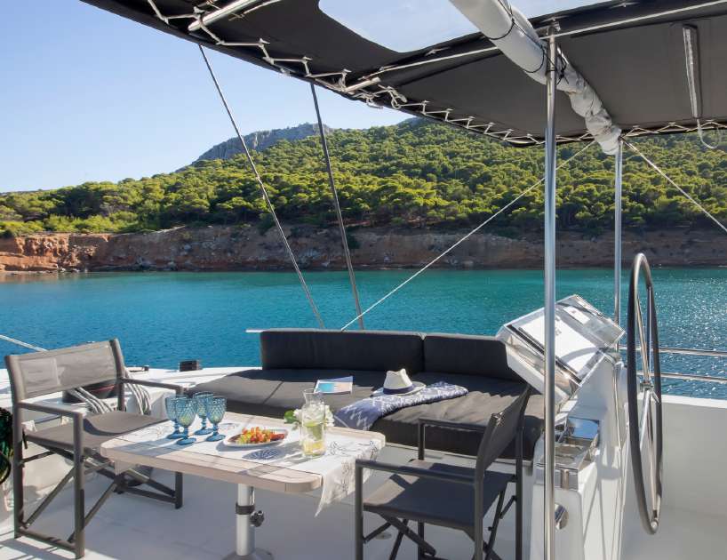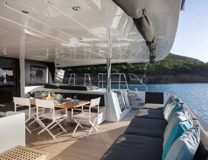 The lower deck places a double en-suite cabin forward and aft in the port-side hull with the central area reserved for the crew. The starboard hull has three double en-suite cabins, and both use forward and aft staircases to connect to the salon above.