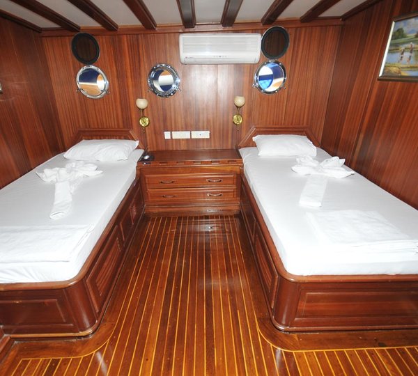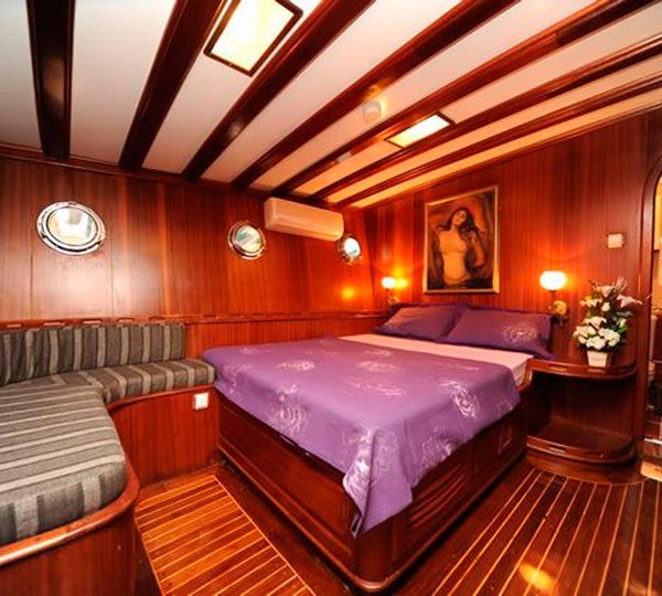 Sailing yacht PRENSES LILA has a warm interior, featuring fine mahogany woods, stylish soft furnishings and quality stainless steel fittings. The salon and dining are an open plan with ample seating, a large formal dining table, coffee table, TV and music entertainment, large panoramic windows providing scenic views and ample natural light. Aft of the salon are 2 master staterooms, forward of the salon are the 2 VIP, 2 double and 2 twin guest cabins.
