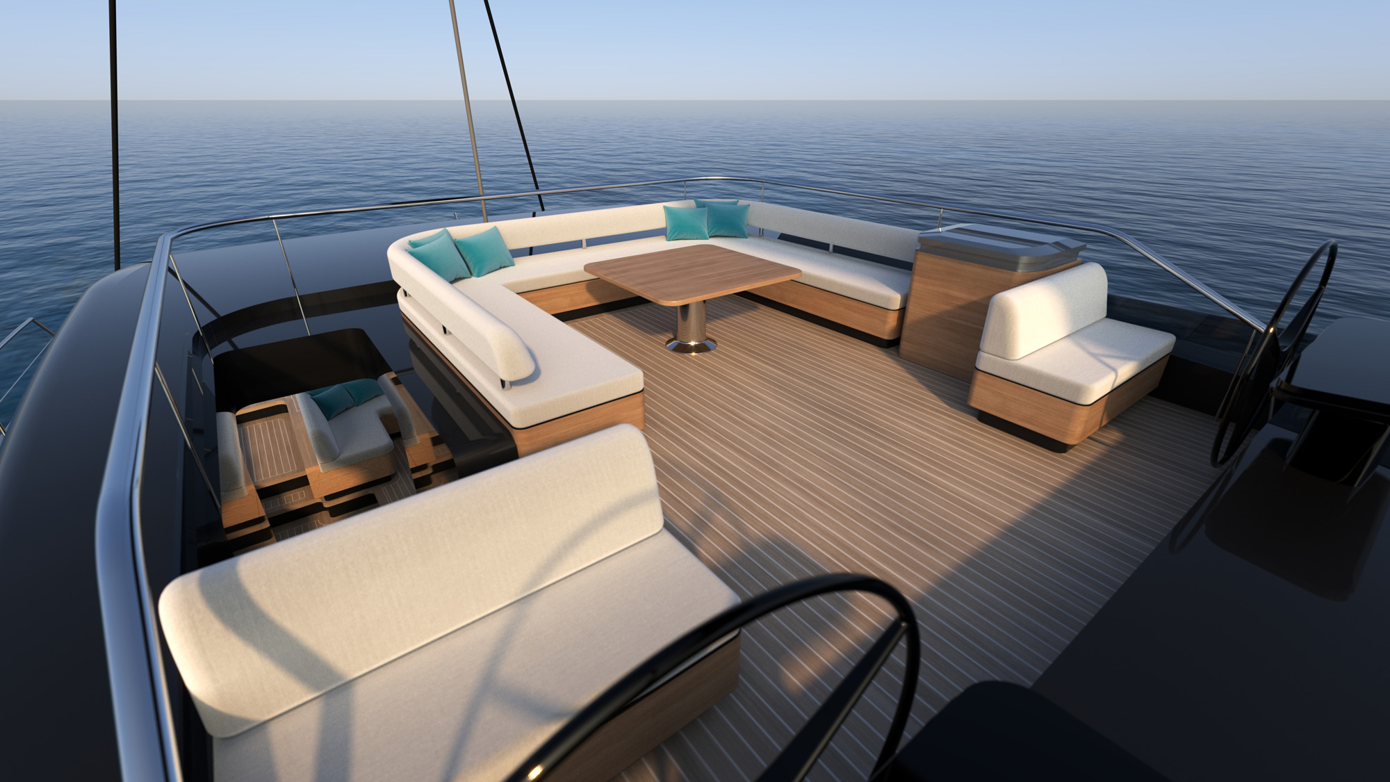 From the main deck, a starboard stairwell leads to the upper deck, which features another sofa seating area with built-in table. Its elevated position ensures fabulous views while enjoying al fresco meals in the sun.