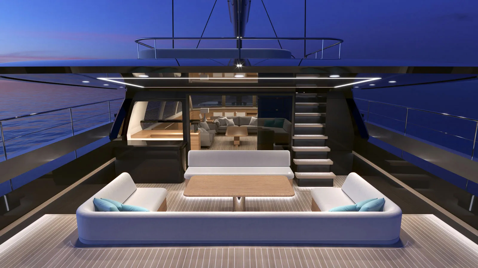 This sleek yacht features a variety of outdoor living areas. At the stern is a spacious seating area, with sofa couches surrounding a large table. Two stairwells lead down to the swimming terrace, complete with water toy pier.