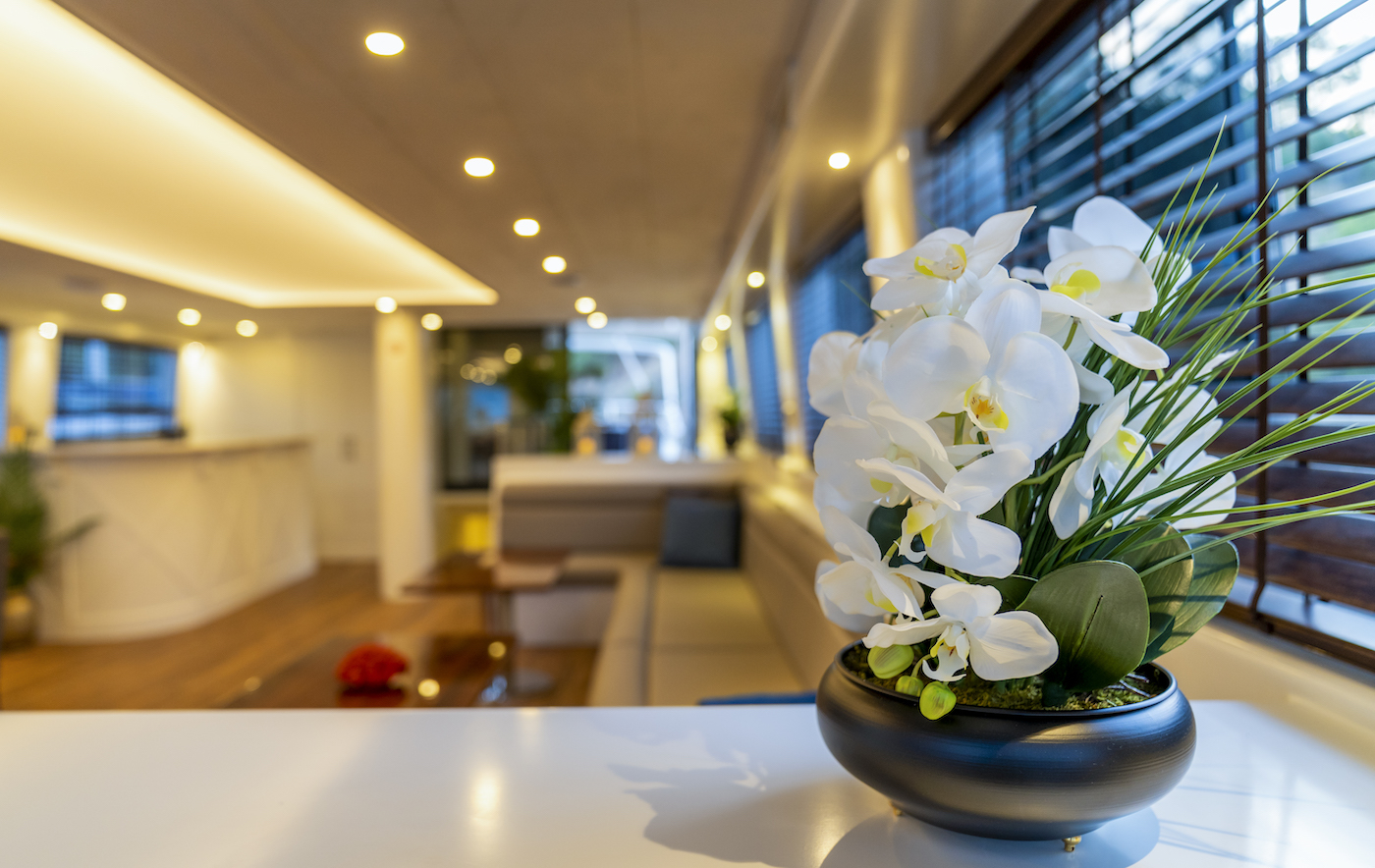 Up on the flybridge, the aft and amidships sections can be covered by a canvas bimini to ensure outdoor use throughout the day. The stern section is used for storing the tender while cruising, and the amidships space is left clear for exercise such as yoga. Corner sofas and drinks tables are fitted to the port and starboard sides, and a sofa is forward to port along with the helm controls.