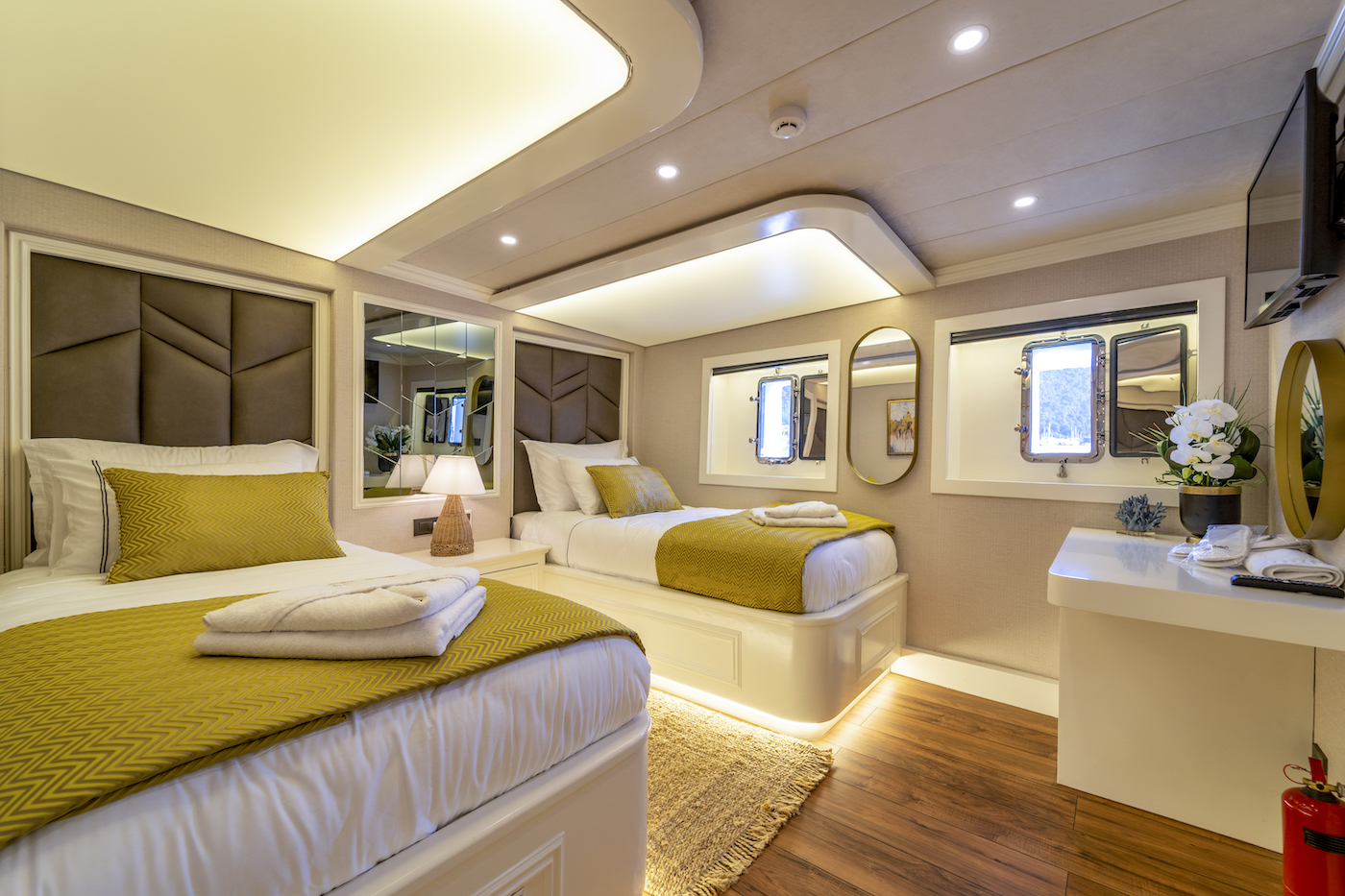The accommodation sleeps a maximum of 12 guests across 6 en-suite cabins: 2 Master suites, 3 double cabins and 1 twin cabin.