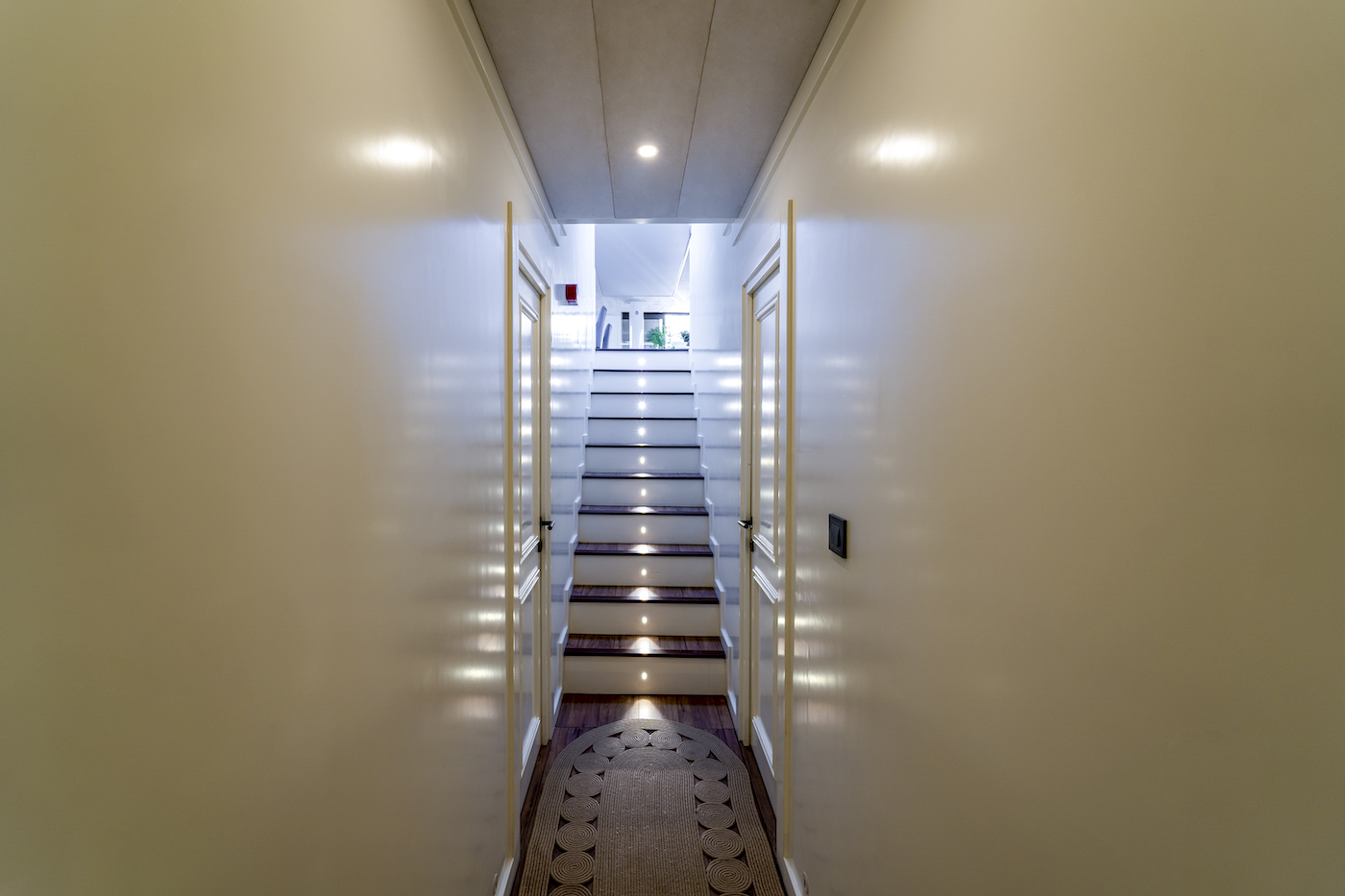On the lower deck, the guest accommodation is split into three forward and three aft suites. The crew accommodation and galley are forward of amidships and are accessed via a separate stairway to the guest accommodation, and the engine is aft of amidships.