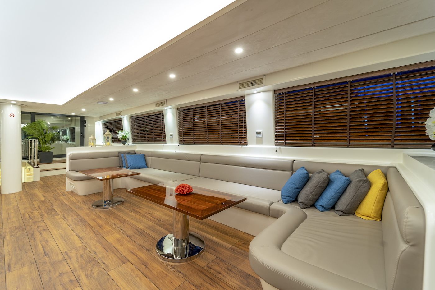 Side walkways lead around to the foredeck, where there is a broad sofa and generous sunbed for guests to savour the sunshine along with panoramic views of the stunning Eastern Mediterranean.