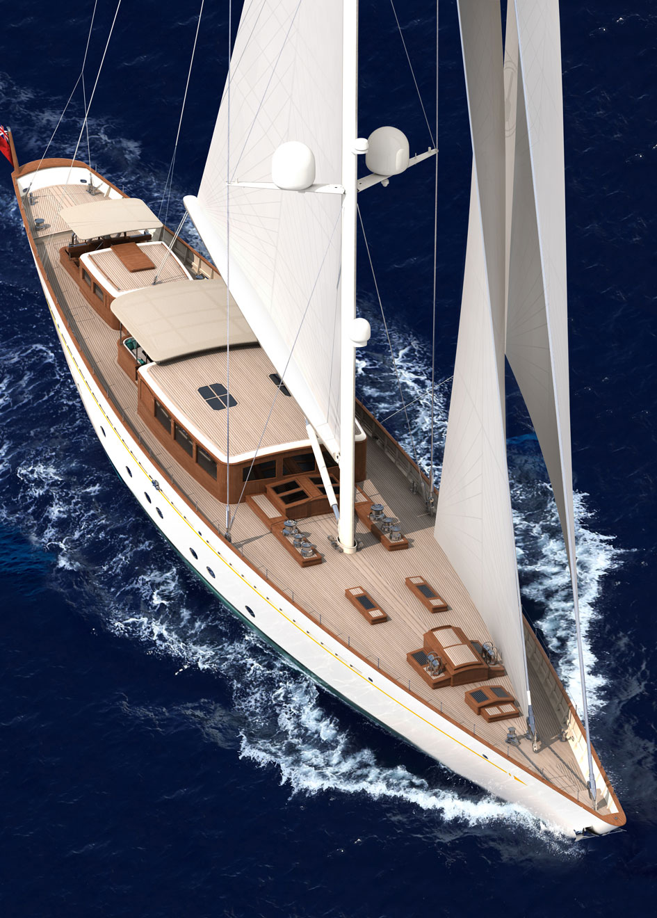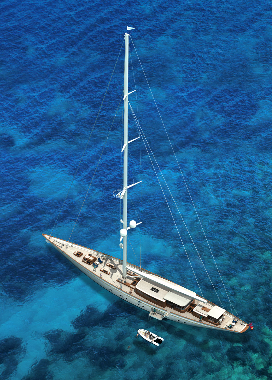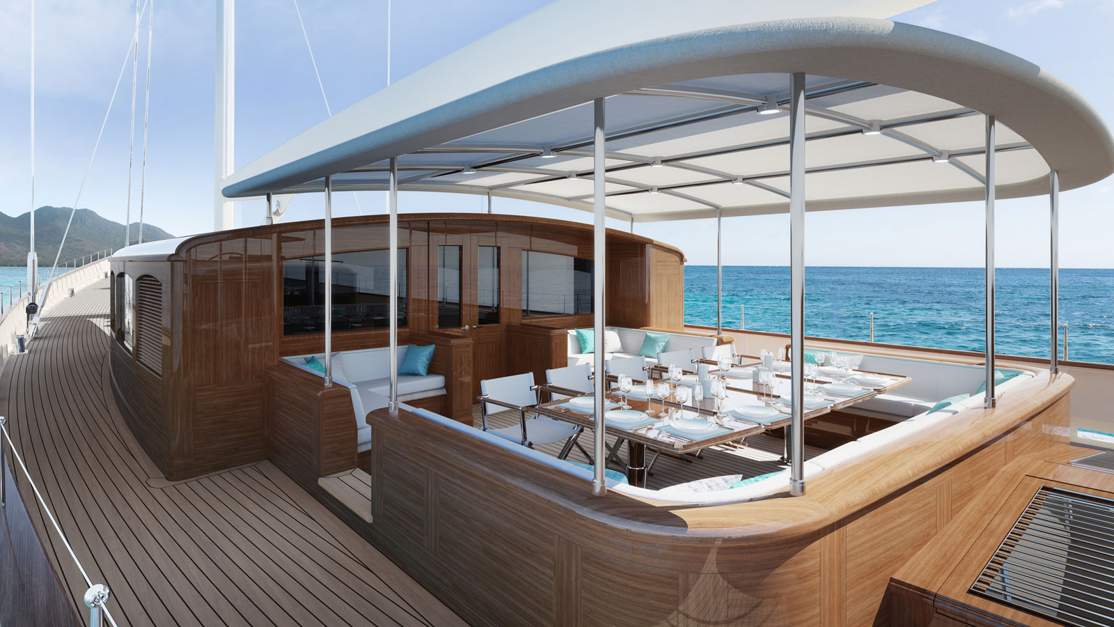 The sailing yacht’s long, elegant lines give her a classic appearance, with plenty of space for relaxing outdoors. The main cockpit is situated aft, and protected from the element by the main deckhouse in front. There is a large table with surrounding couches, creating an excellent place for guests to dine al fresco while enjoying the surrounding views.