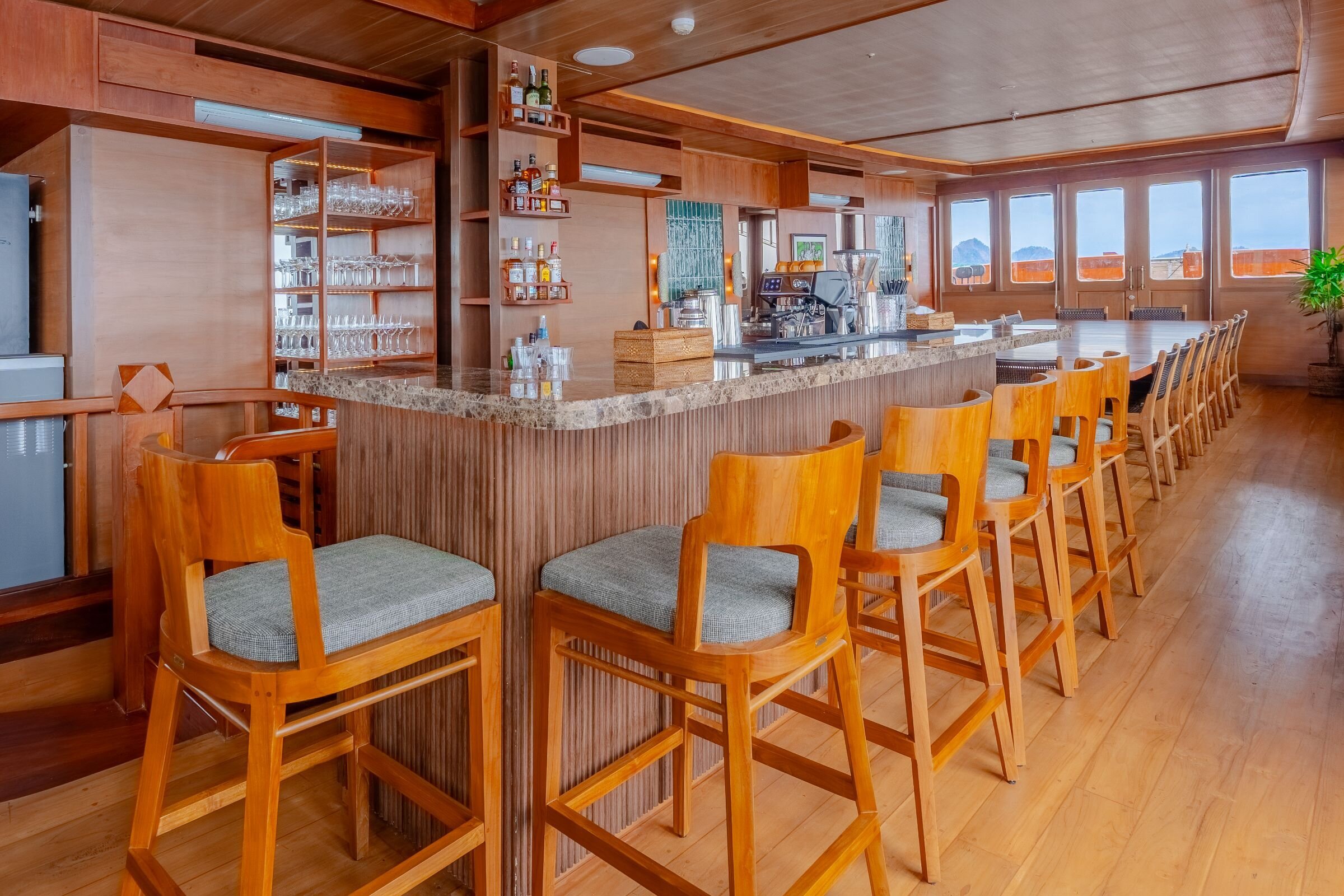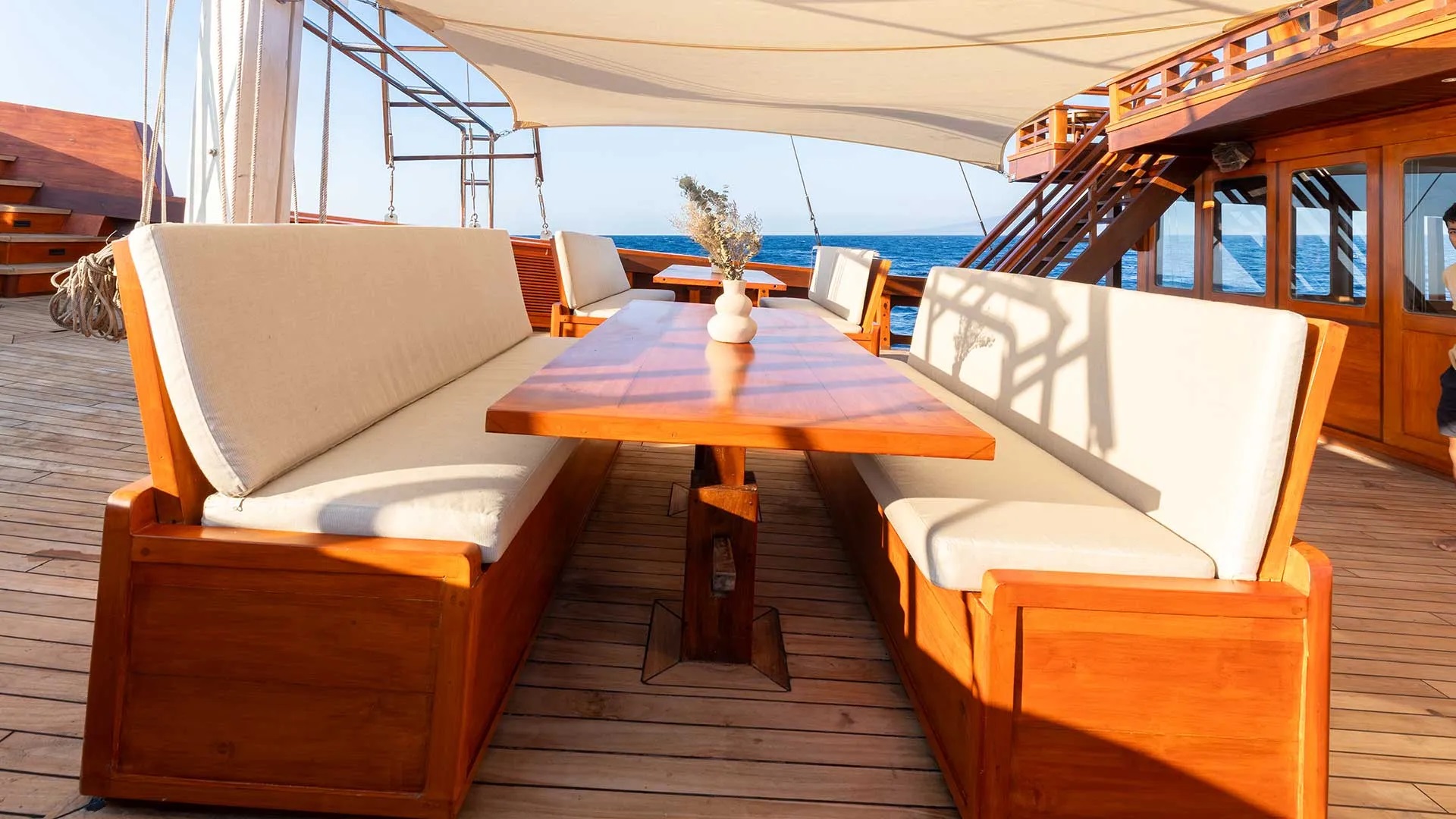 The traditional wooden hull and decks provide plenty of exterior space for guests to unwind and enjoy the views. The sun deck offers sun beds and an elevated jacuzzi plus an open space perfect for daily yoga sessions.