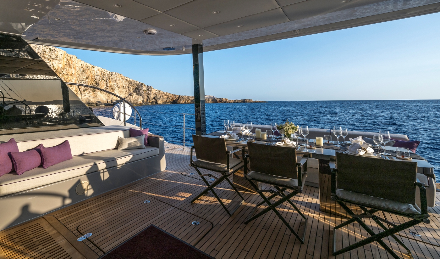 The foredeck terrace boasts a sunken lounge fitted with a choice of sofas, sun pads on either side and two large forward trampolines. Wide gangways on either side of the yacht allow easy access for guests and crew around the exterior.