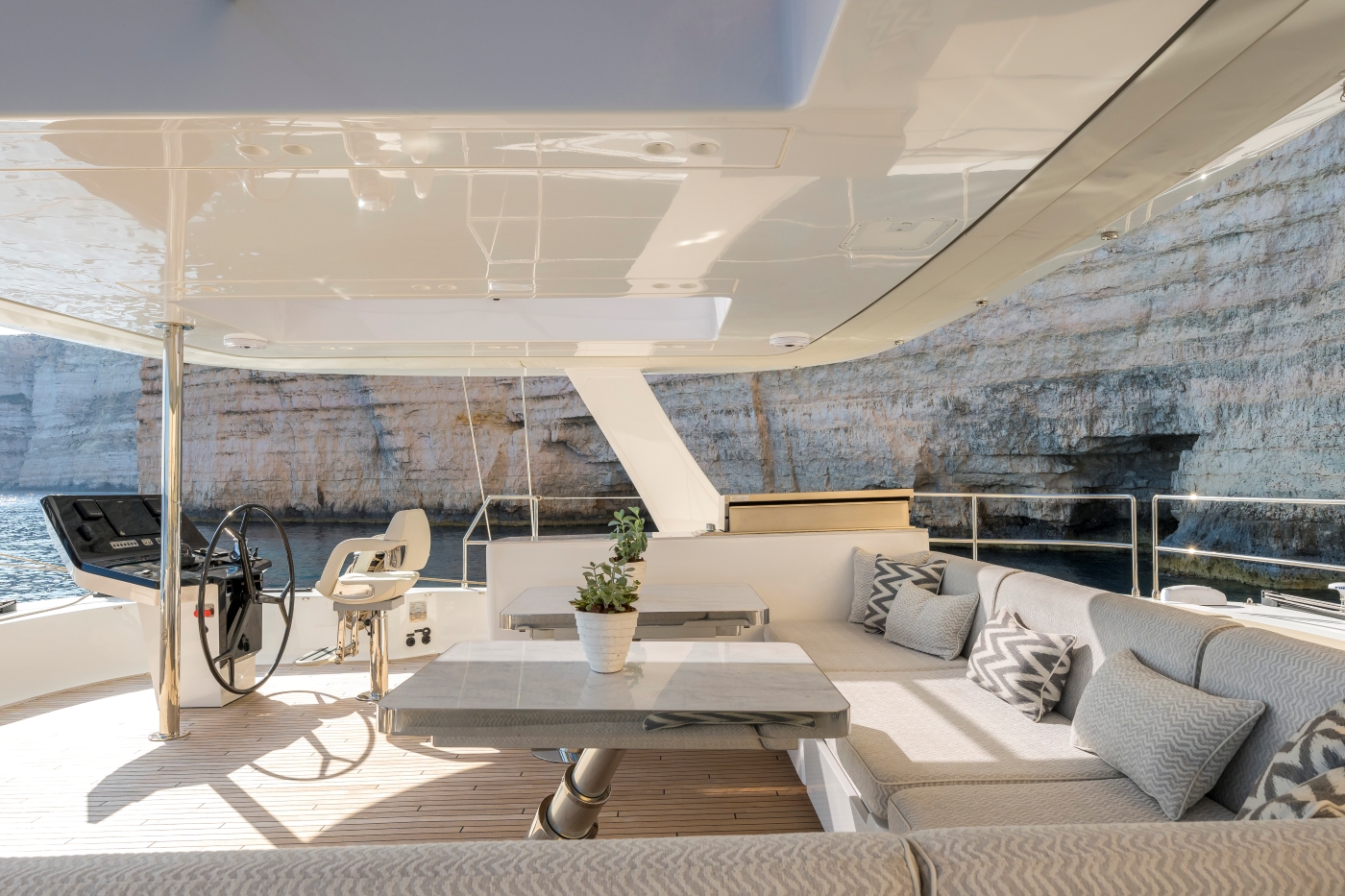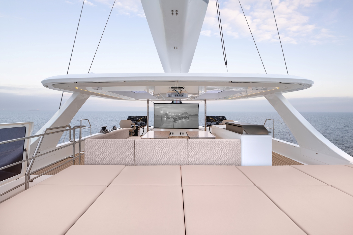 The exterior decks are very spacious thanks to the wide beam seen on catamarans. The aft cockpit is configured with a dining setting and sun pads plus steps down to water’s edge where there is a hydraulic central platform. When the glass doors are opened to the main salon, the space becomes one huge sociable area.