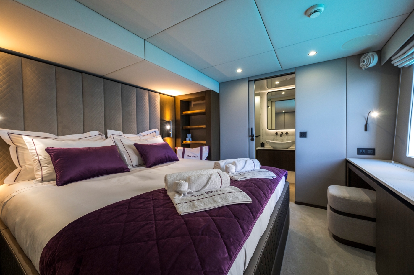 Four luxury suites offer accommodation for up to eight guests across both the port and starboard hulls. The master is amidships in the port hull and is accompanied by a lovely ensuite with separate shower and head. There are three additional double suites – one forward in the port hull and two amidships in the starboard hull – all benefitting from the privacy of ensuite bathroom facilities.