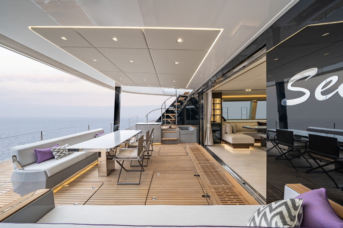 The choice of deck space continues with the flybridge where a sun deck offers a wide arrangement of sun pads overlooking the stern and a covered dining setting with a sofa wrapping around a flexible table. Adjacent to the dining table is a bar and grill allowing the chef to cook al fresco, plus there are dual helm controls forward.