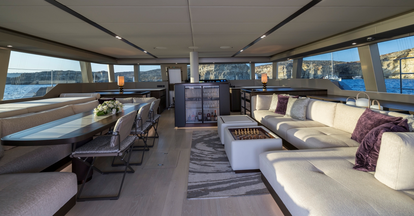The stunning interior blends blonde wood flooring, oversized modular sofas in neutral tones and a flexible dining table and coffee table. There are windows all around which fill the space with light and once the aft doors are open creates great flow with the outside – there is also a convenient door out to the foredeck. Forward find a technical navigation area and a convenient pantry.