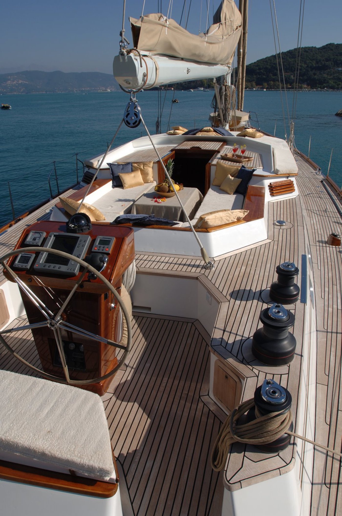 The cockpit amidships is fitted with a forward-facing C-shaped sofa and a table in the centre for casual alfresco dining and/or drinks. There is a canvas shade that can be erected or removed to suit guest preferences. The helm controls are behind with padded seating along the stern, and the spacious foredeck has plenty of room for sunbathing, exercise and observation while at anchor.