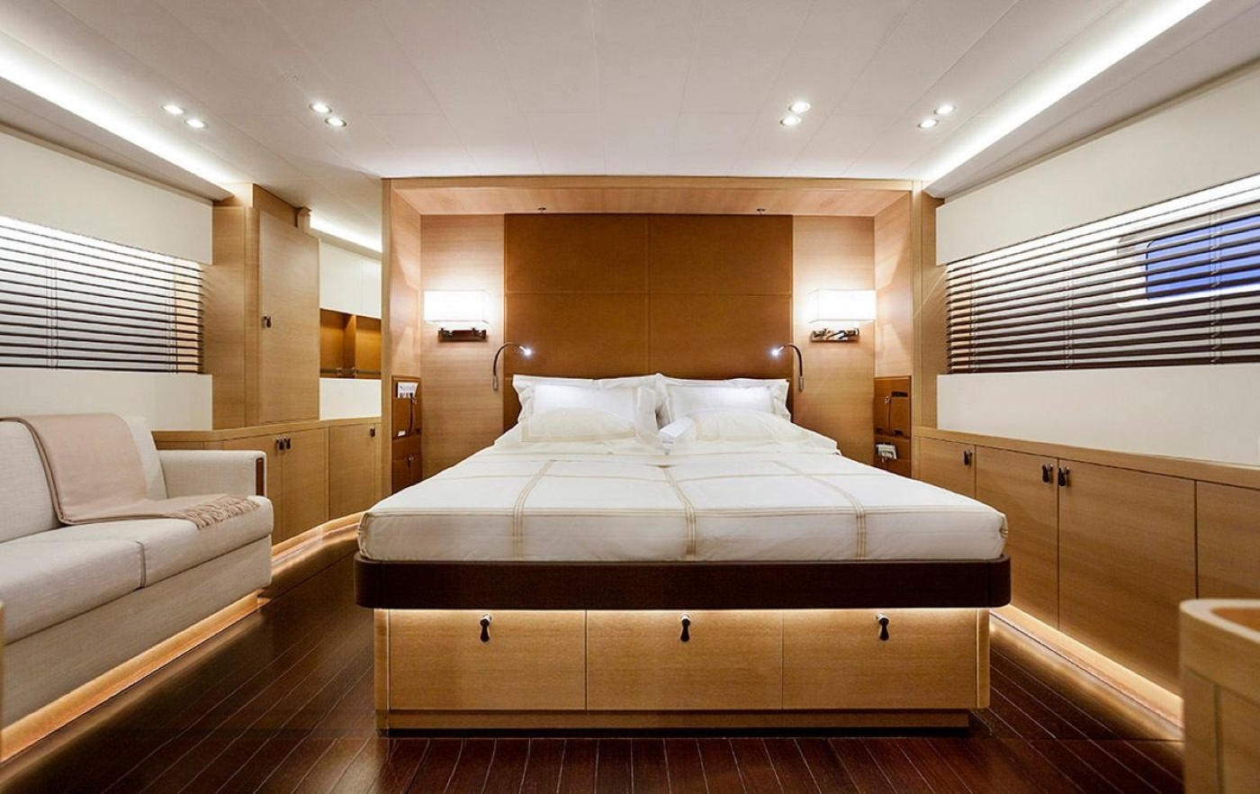 The accommodation is generous in 4 en-suite cabins. The master suite is forward and full beam of the yacht, with a center lined king size bed, seating and vanity. The VIP cabin is aft of the salon to port, with a double bed. Two guest cabins forward of the salon and aft of the master, offer side by side twin beds. Each cabin is fitted with state of the art visual and audio entertainment for optimal enjoyment.