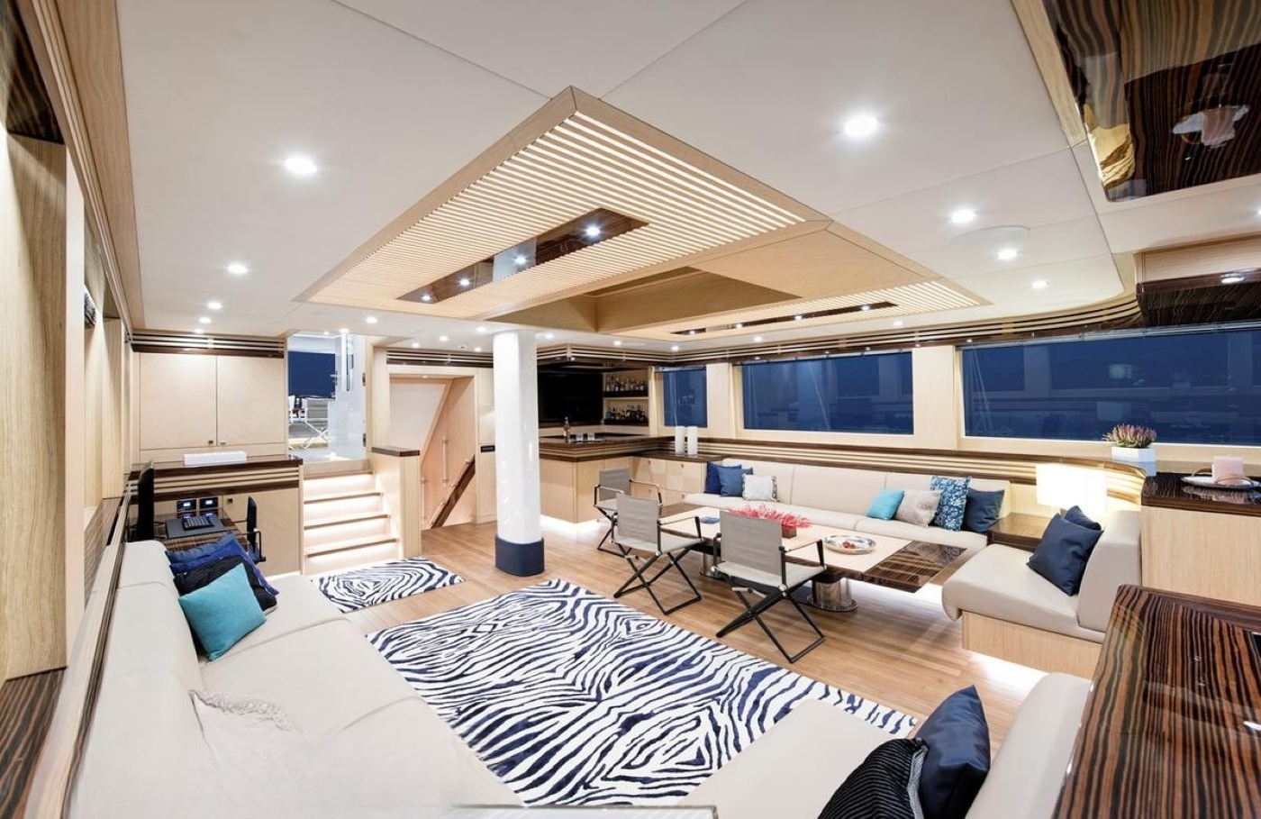 The contemporary interior blends light wood finishes and neutral furnishings with bright signature highlights. The main salon is filled with light thanks to the surrounding windows and is configured with a bar aft, dining setting and lounge forward and helm controls further forward.