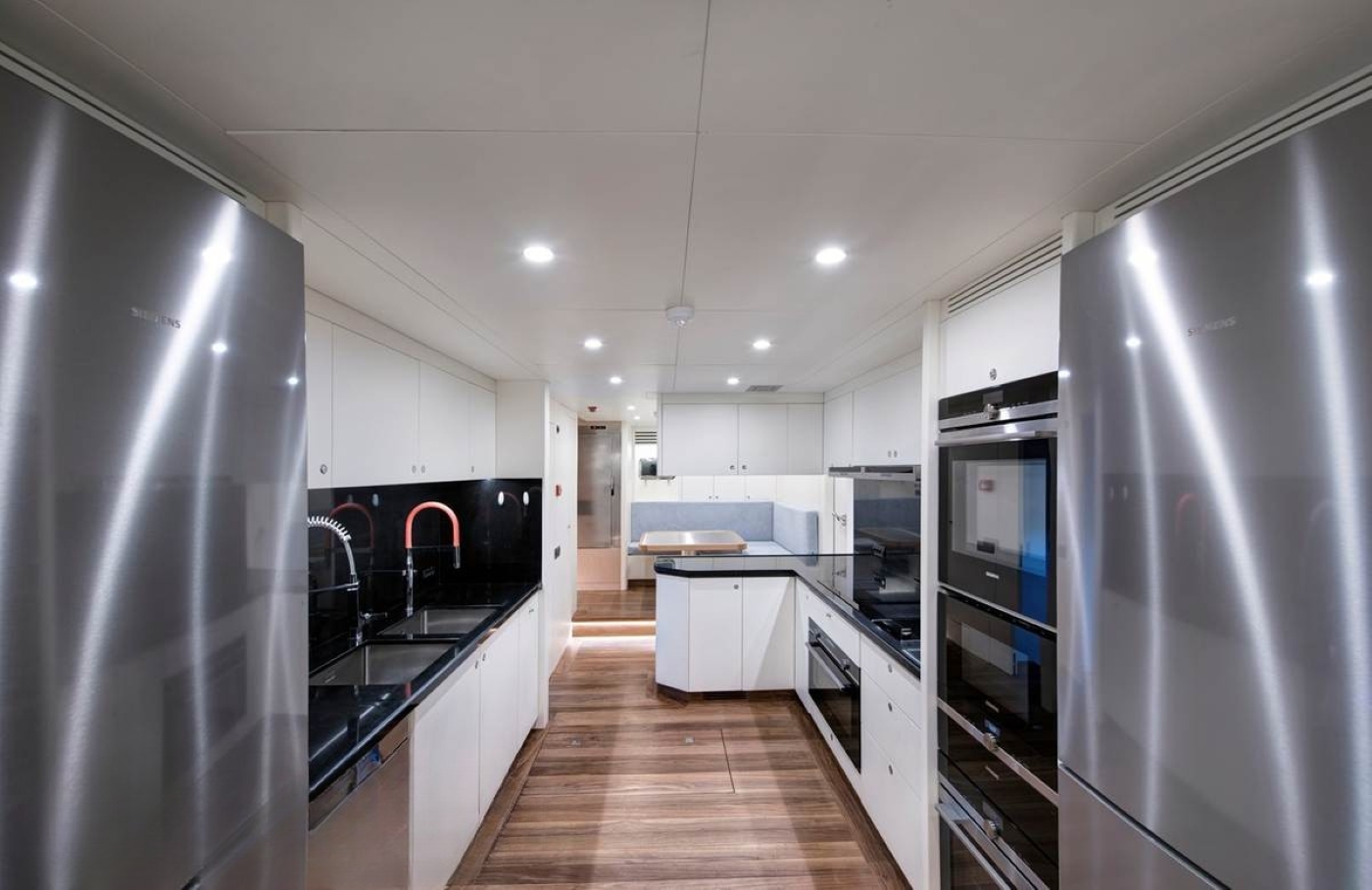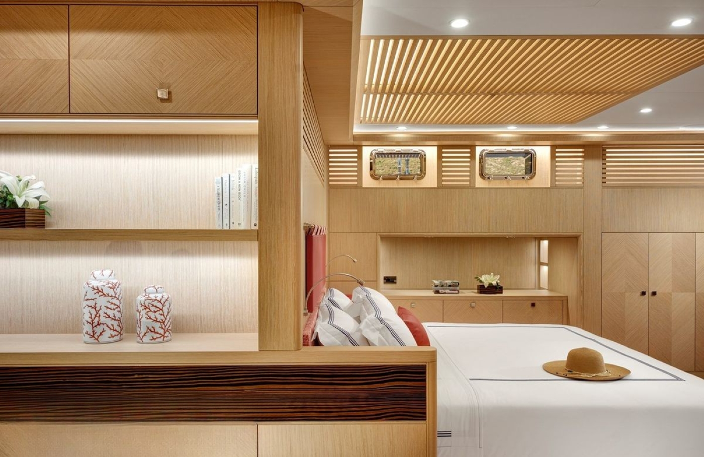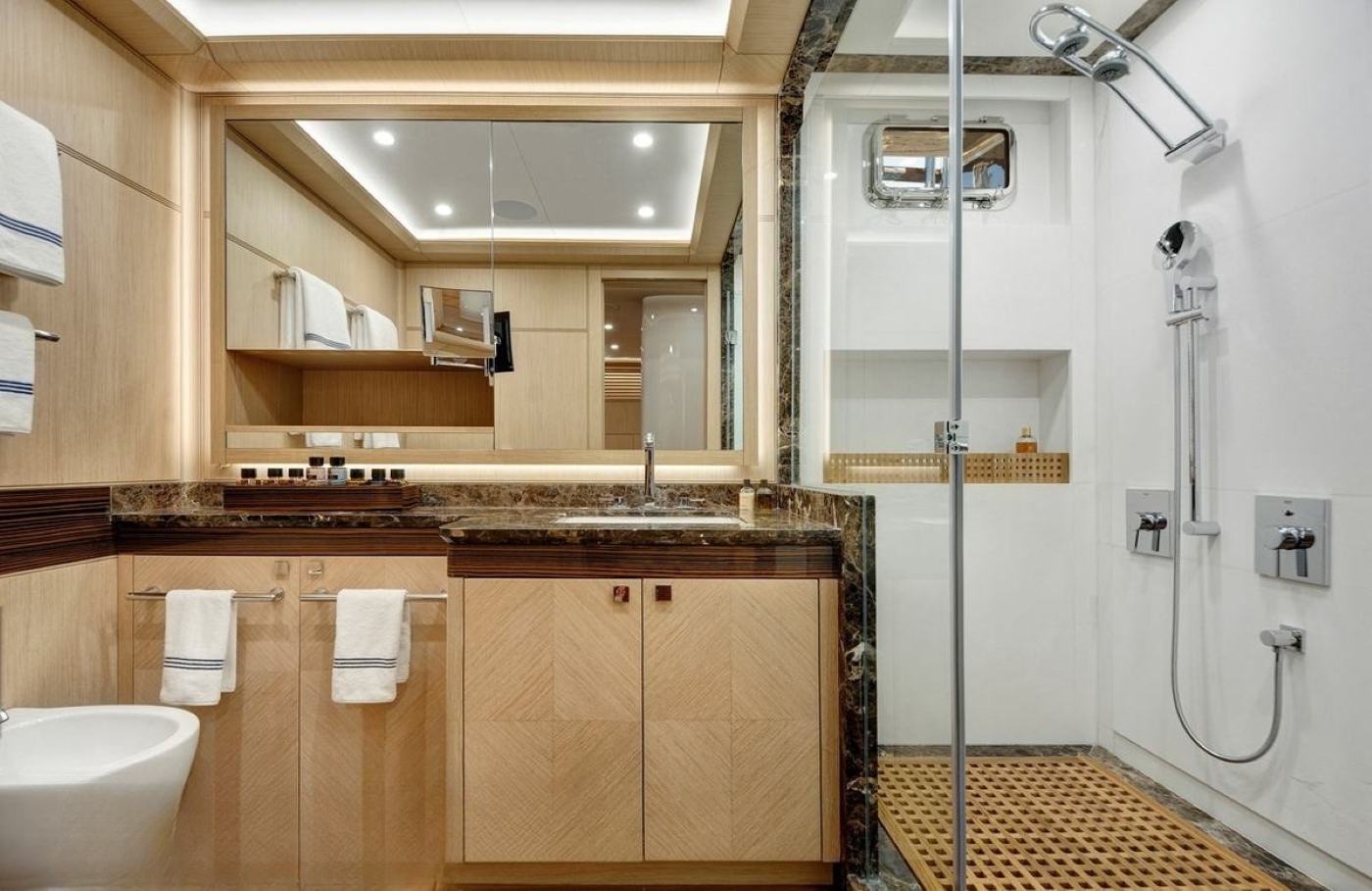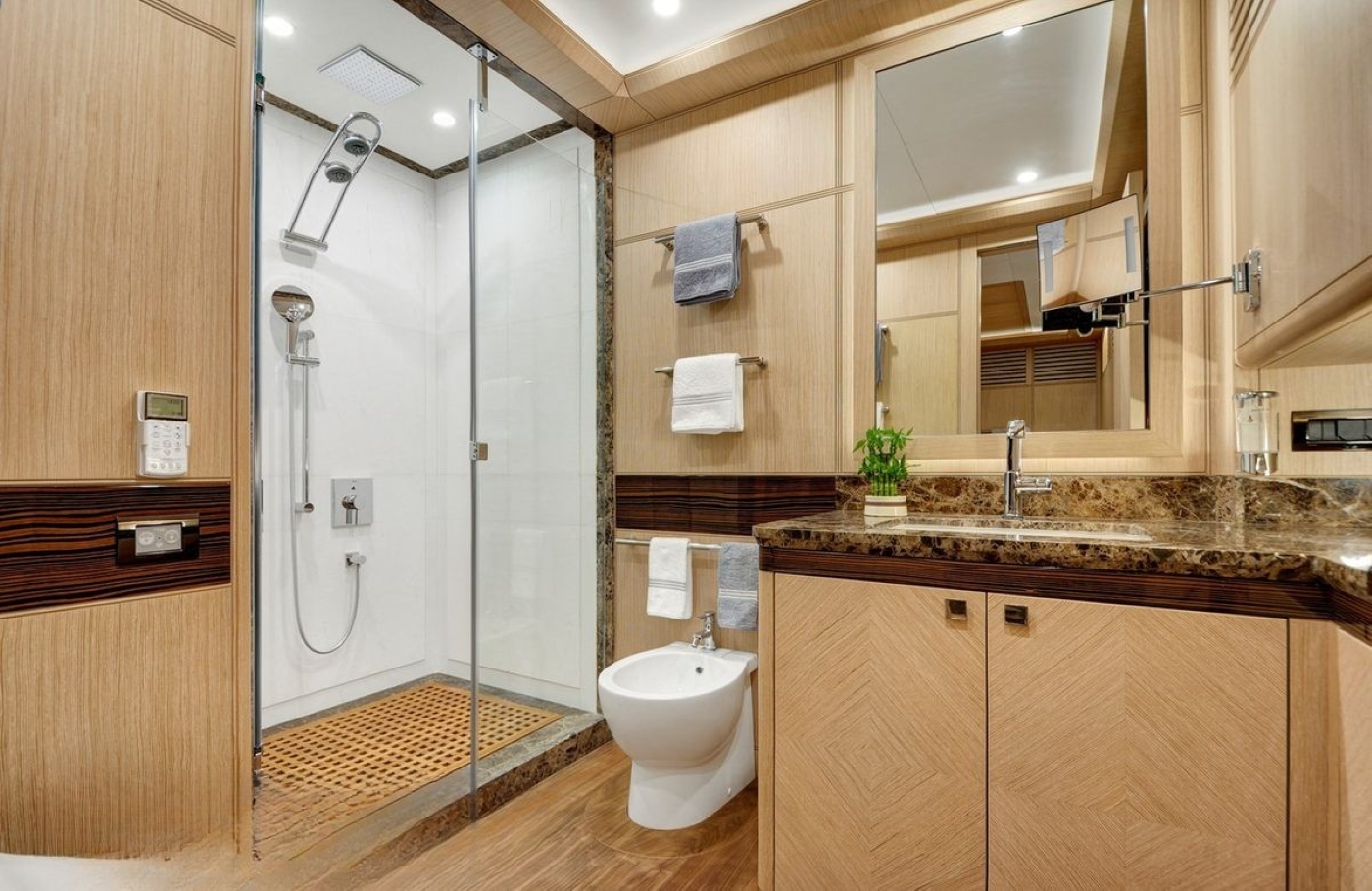 The full beam master suite boasts a king-sized bed, huge dressing area and wardrobes and a luxury ensuite with double shower. The VIP is also amidships and has a deluxe ensuite bathroom and queen-sized bed. The two additional doubles and two twin suites are aft on the lower deck and also benefit from the luxury and privacy of ensuite bathroom facilities.