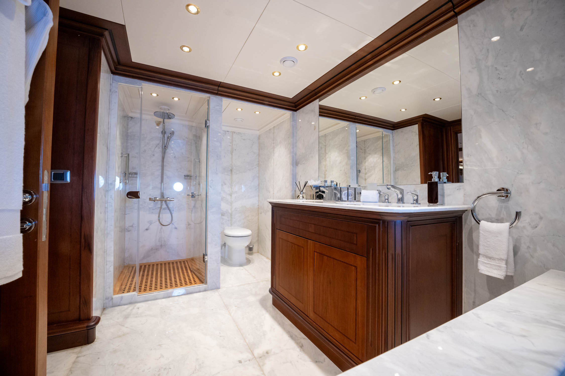 ~Master Stateroom: Full-beam suite aft on lower deck with king-size bed, desk, sofa, wardrobe and large en suite with bath and shower ~VIP Stateroom: Full-beam suite forward on lower deck with king-size bed, sofa, wardrobe and en suite with shower ~Guest Double Cabin 1: Queen bed to port, en suite bathroom, Smart TV ~Guest Double Cabin 2: King bed to starboard, en suite bathroom, Smart TV ~Triple Cabin 1: Queen bed + single bed, ideal for families, en suite bathroom ~Triple Cabin 2: Queen bed + single bed, en suite bathroom ~Twin Cabin: Two single beds, located near master suite for staff or supernumeraries, en suite bathroom