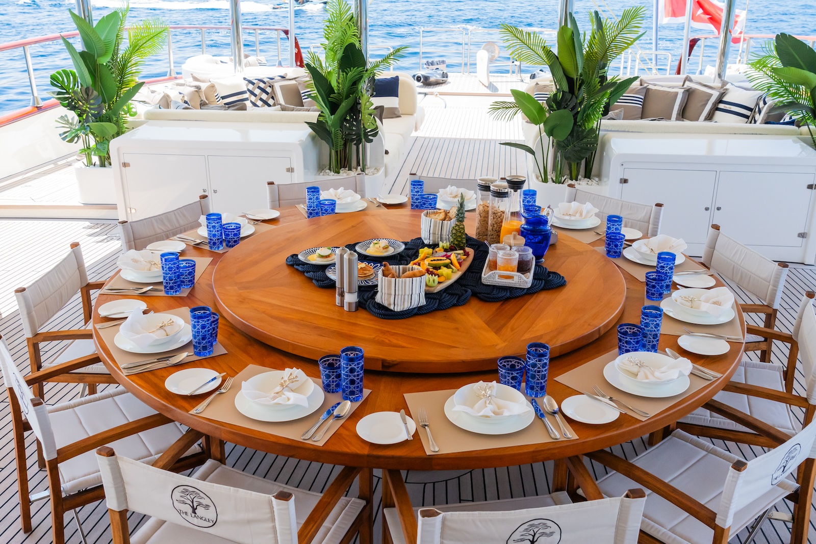THE LANGLEY offers a wealth of outdoor space across her multi-level decks. The expansive sundeck is the social heart of the yacht, featuring a central Jacuzzi surrounded by oversized sunpads, casual lounge areas and a fully equipped bar and grill. Shaded aft dining provides a breezy, elegant setting for long lunches or candlelit dinners, while the forward areas are perfect for sunbathing in complete privacy.