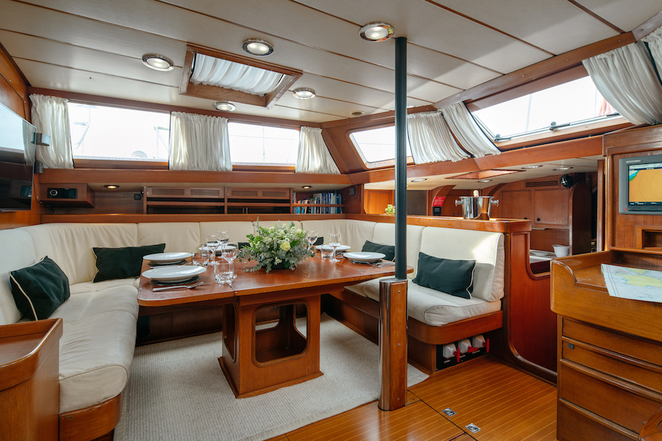 The spacious and light saloon boasts a u-shaped settee surrounding an expansive and attractive dining table, flat screen TV and Fusion sound system to port. Starboard includes chart table and instruments plus another settee.