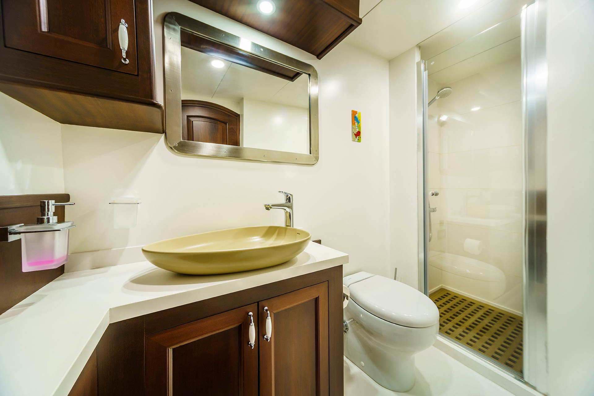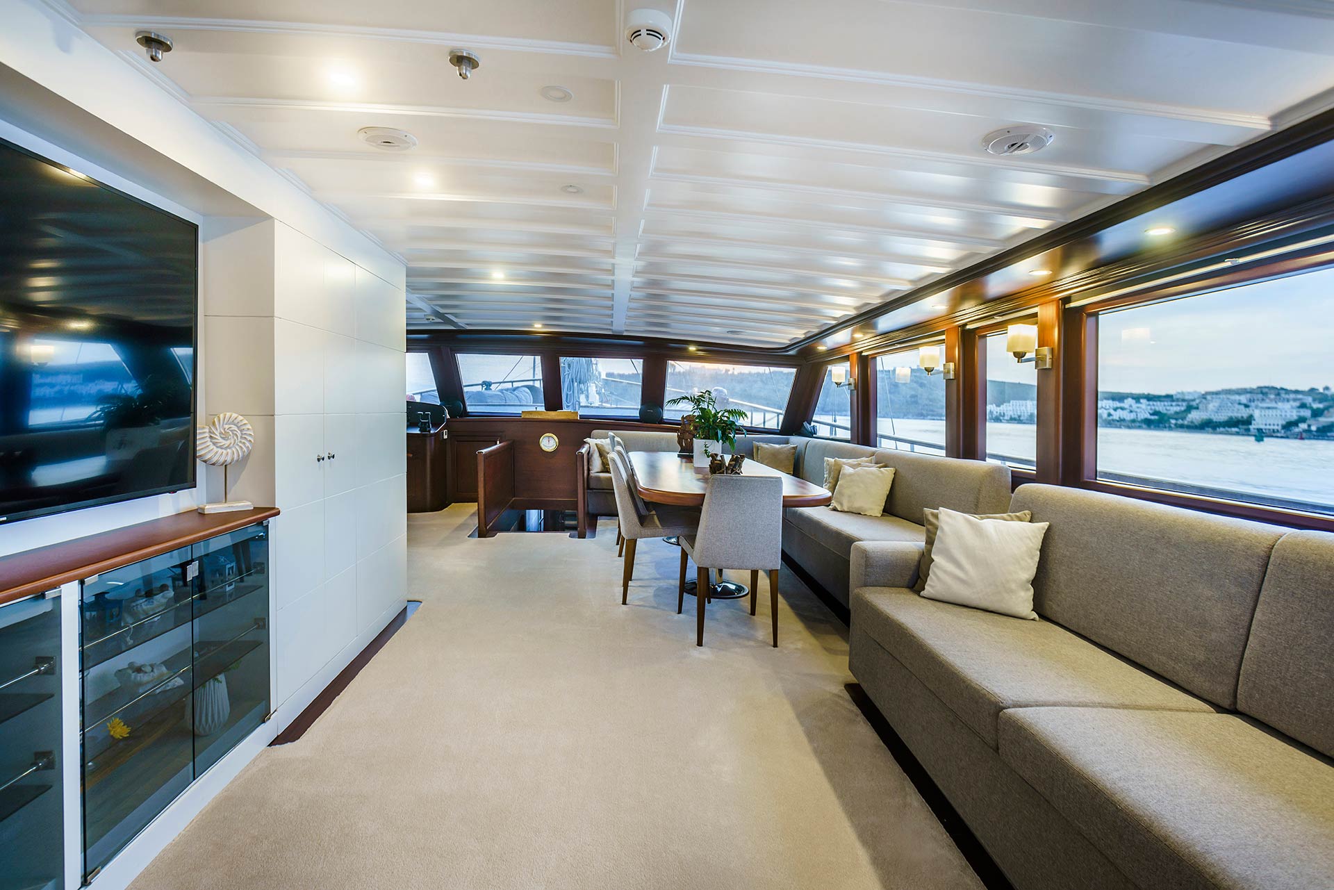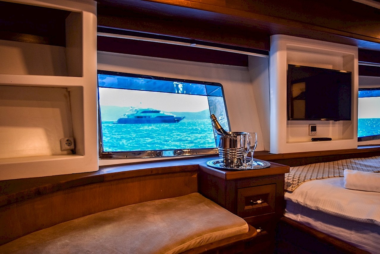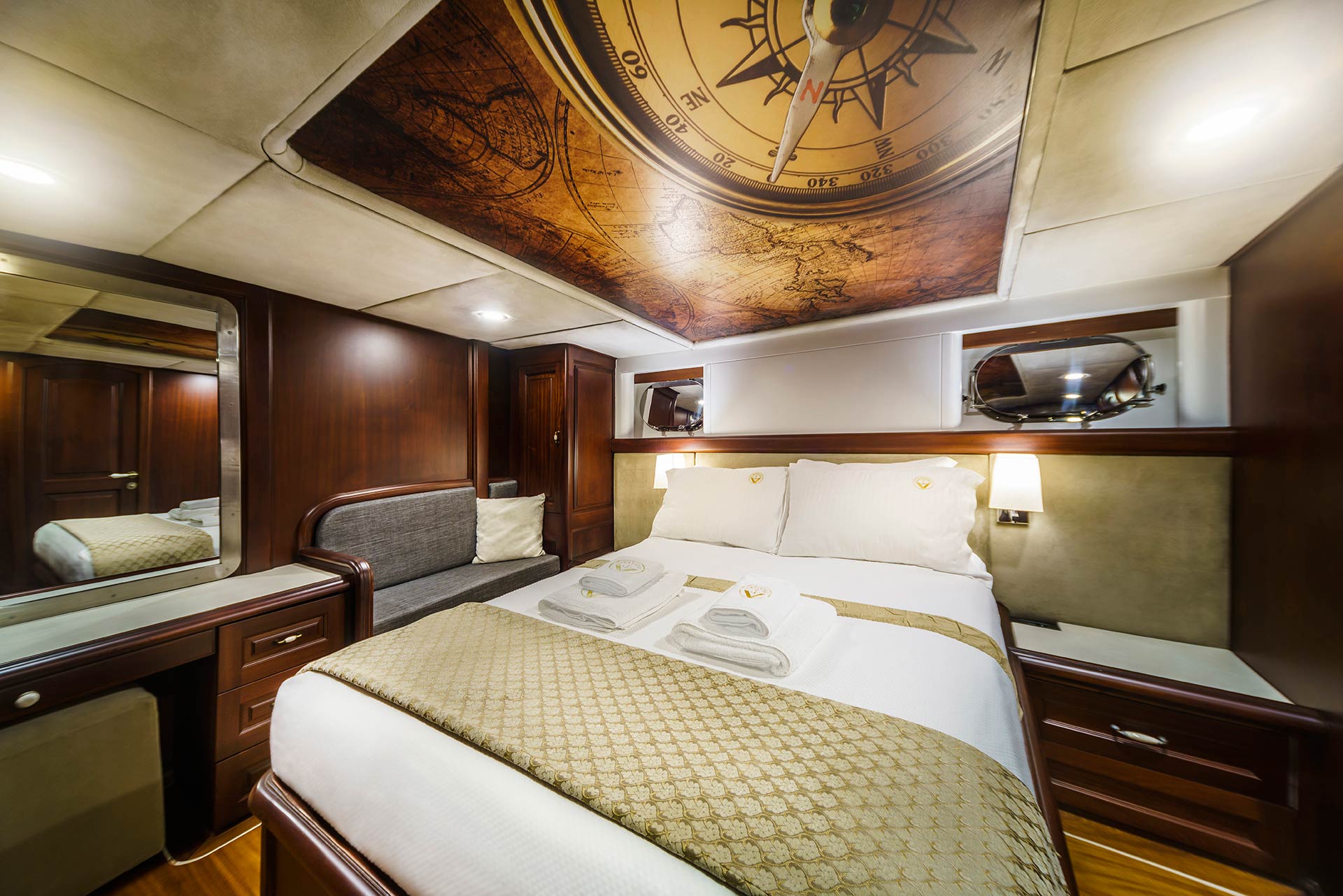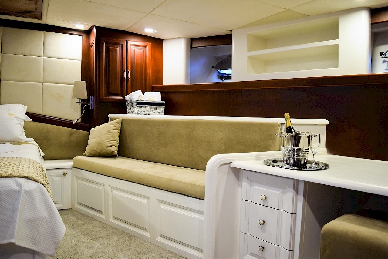 Accommodation is located on the lower deck, and consists of 2 Master cabins, 3 double cabins and 1 twin cabin. Both Master cabins span the full beam of the yacht, and both feature king-sized walkaround beds. Both have wall-mounted TVs across from the beds, so that guests can relax, unwind and enjoy a movie together. There is plenty of cupboard storage, as well as additional seating and ensuite bathrooms. The remaining cabins, 2 doubles and 1 twin, are all extremely comfortable and feature excellent amenities such as TVs with satellite, lots of cupboard space, and porthole windows that open so guests can enjoy and sea breeze. There is additional capacity for a crew of 6, who will provide guests with a safe and unforgettable stay.