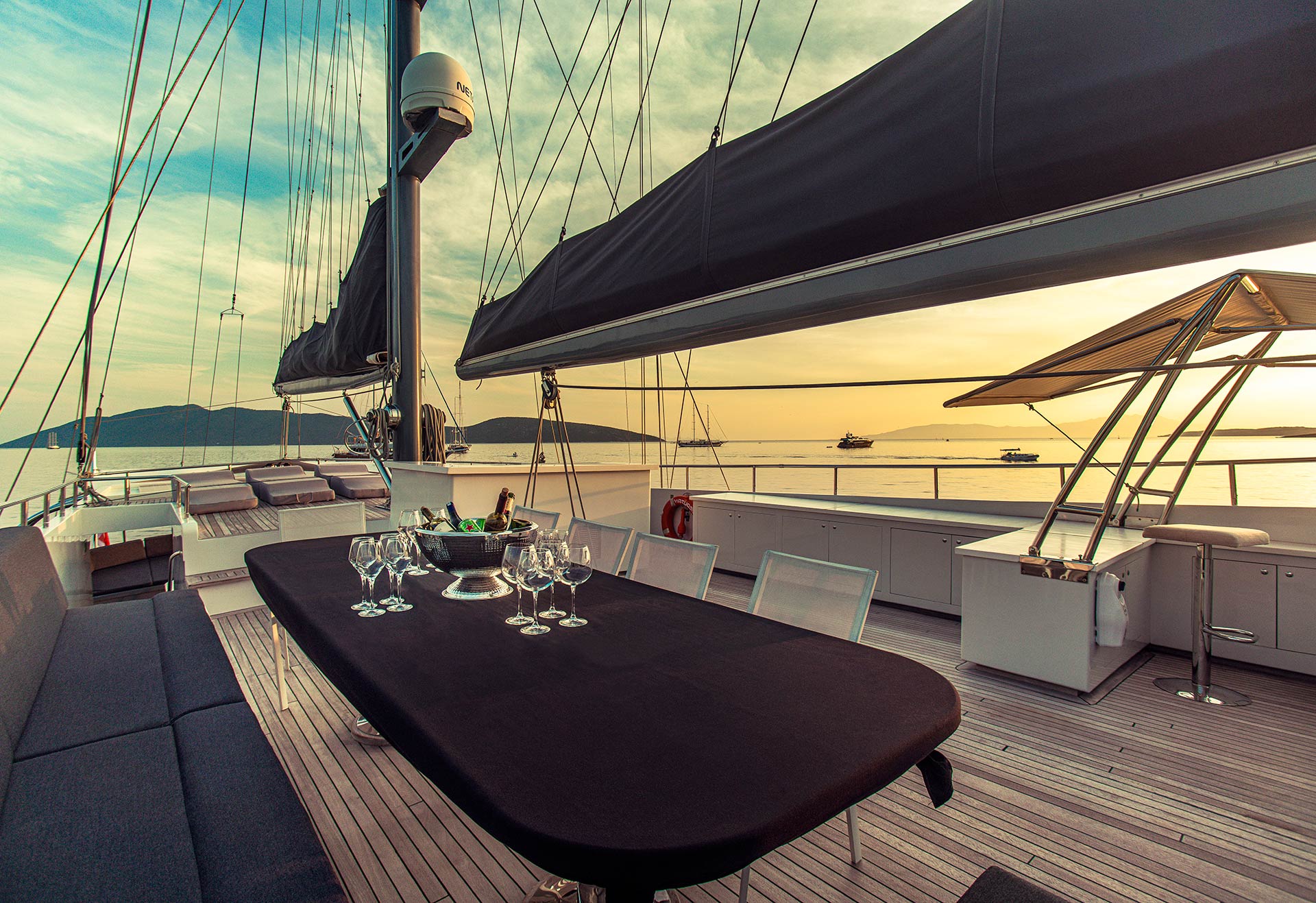 This stunning motor sail yacht features an abundance of spaces for guests to soak up the sun. The main aft deck hosts a large dining, with built in square couches against the stern. The area is protected by the sundeck overhang above, as well as an optional bimini cover. Around on the foredeck are more comfortable couches, with handy coffee tables for resting snacks and drinks.