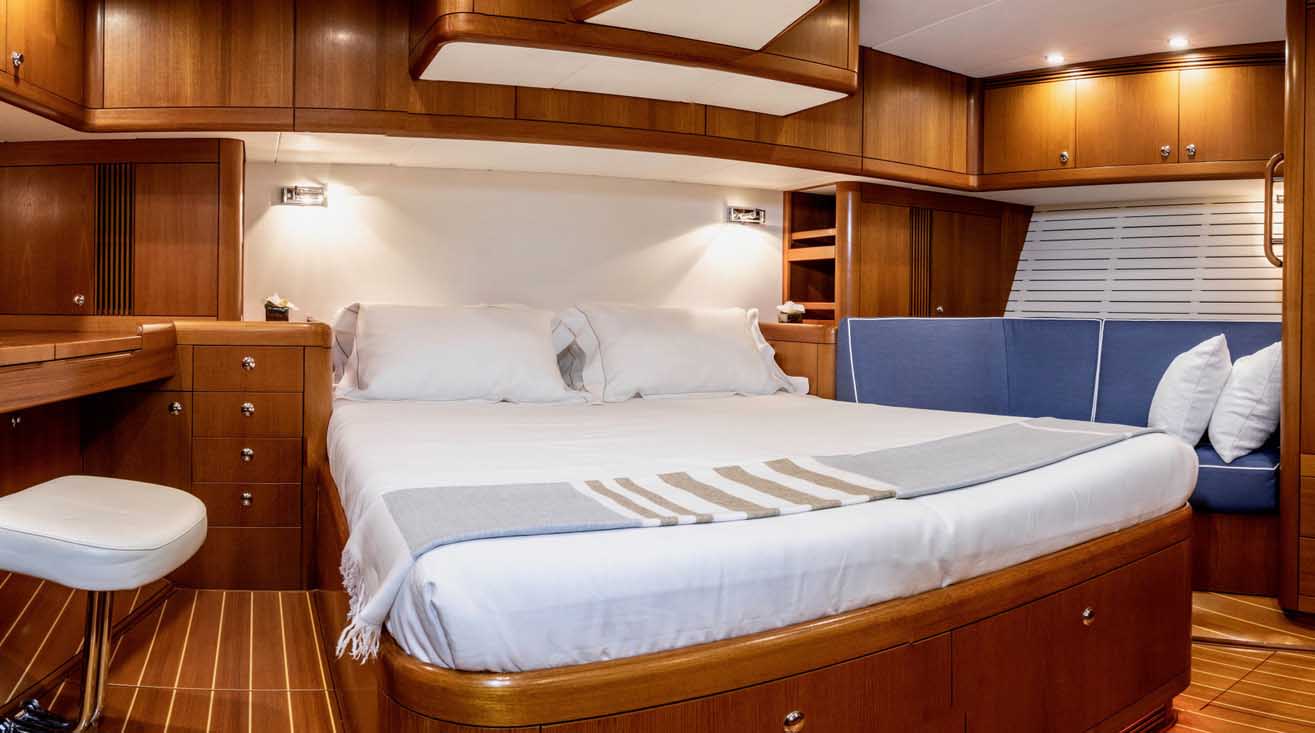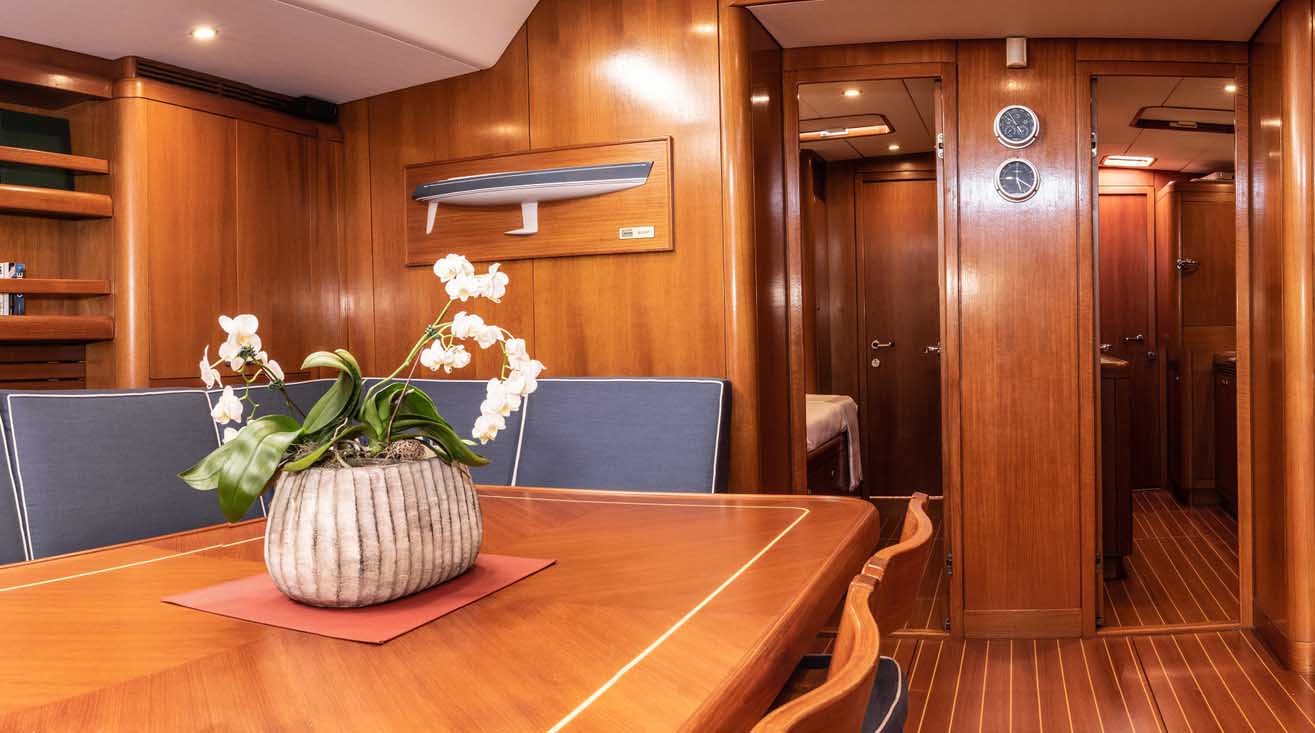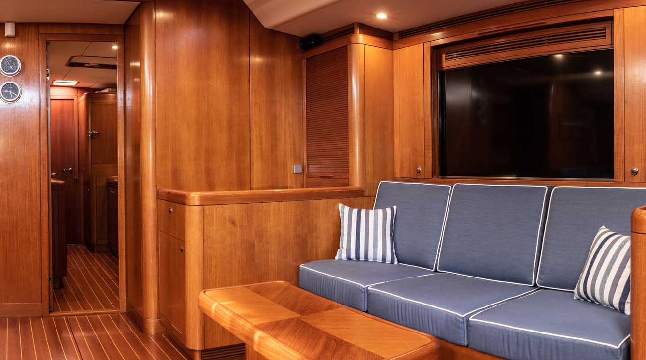 Her main saloon is divided into two areas, a big table that will seat eight guests comfortably, and a sofa for relaxing. The salon is equipped with a 42" flat screen, Dolby surround, DVD and Play Station 3, Icemaker and wine cellar, and a wide chart table with all navigation equipment for safe sailing.