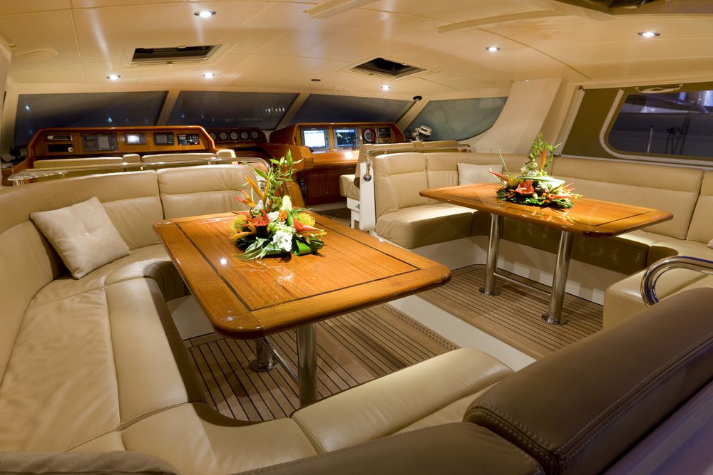 Her main salon has a large dining table, a TV set with an A/V entertainment system, and a seating area. Charter guests will enjoy the stunning panoramic views from the salon, whether it's a striking sunset in a romantic destination or a thrilling racing event.
