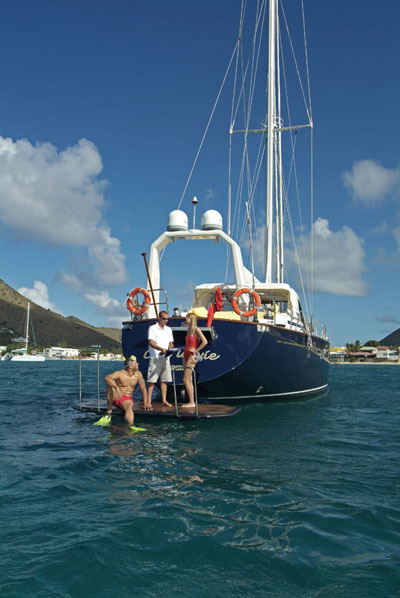 Tenders & Toys (1) 4m Zodiac tender w/40hp four stroke engine, (1) inflatable donut, snorkeling gear, wakeboard and skis. Communications Satellite telephone and fascimile. Cellular phone available. Audio Visual Equipment and Deck Facilities Satellite flat screen TVs with receivers for USA and Europe, along with CD and DVD players in each cabin and the salon. Home theatre speaker system in the salon. WIFI in port. I-POD plugs in each cabin and the salon. The aft deck area has large new cushions for sitting and sunbathing. There are new sunning cushions on the foredeck as well.