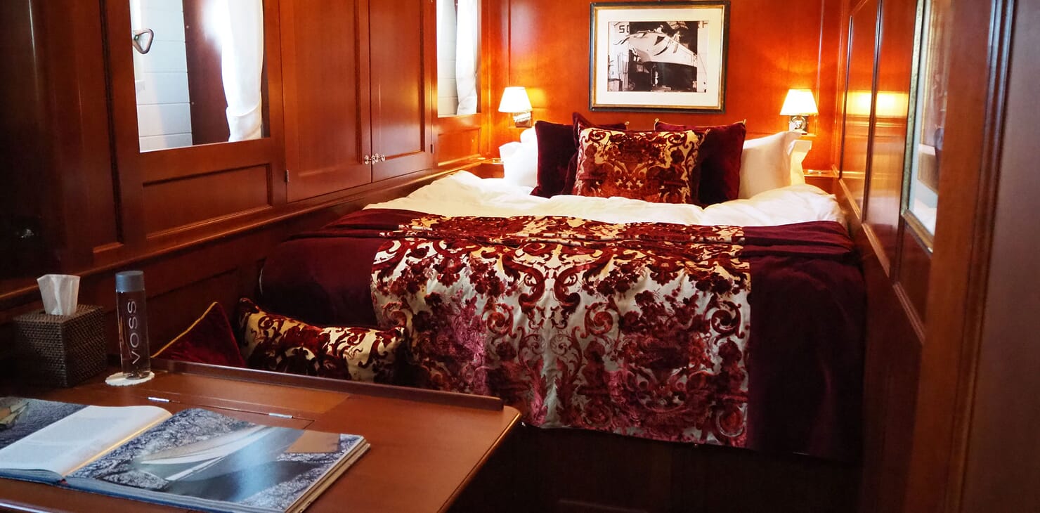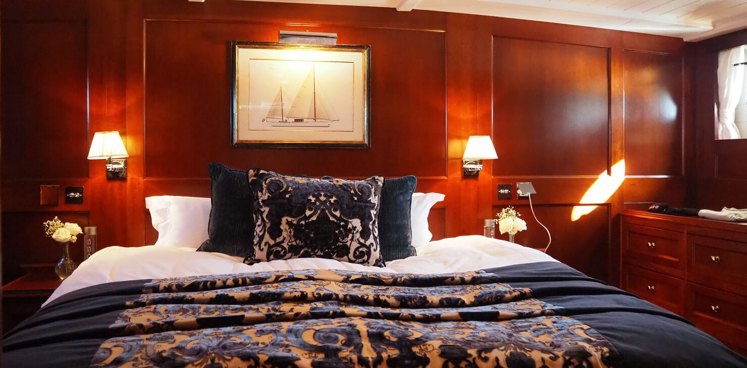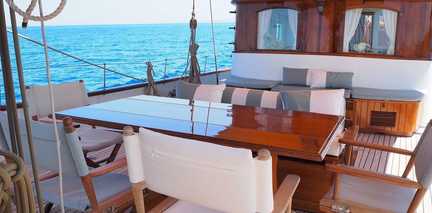Accommodation is situated on the lower deck and consists of 1 Master cabin, 1 double and 1 twin cabin. The full beam Master cabin exudes timeless luxury, with rich furnishings and beautiful woodwork. There is a large centerline bed, plenty of storage, and a convenient desk area. The cabin is complete with ensuite bathroom, which features sink, toilet, and shower, as well as the beautiful classic stying of the Master cabin. Both the double and twin cabins are very comfortable, and also offer plenty of storage as well as ensuite bathrooms. A professional and friendly crew of 4 will ensure every detail is taken care of.