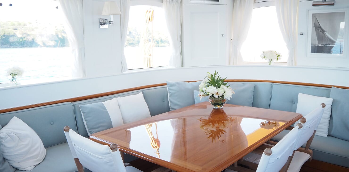 Inside, the deckhouse features a wonderful dining area with a curved couch and dining chairs accompanying the table which can seat all six guests. The space is surrounded by the large deckhouse windows, flooding is with light and making a wonderful spot to enjoy the sunset.
