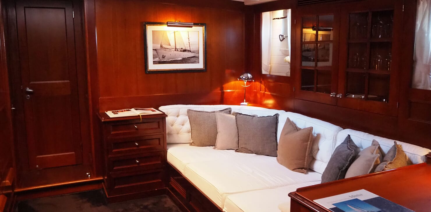 The lower deck boasts another lounge area, with classic styling and deep mahogany giving the space a wonderful relaxed and warm feel.