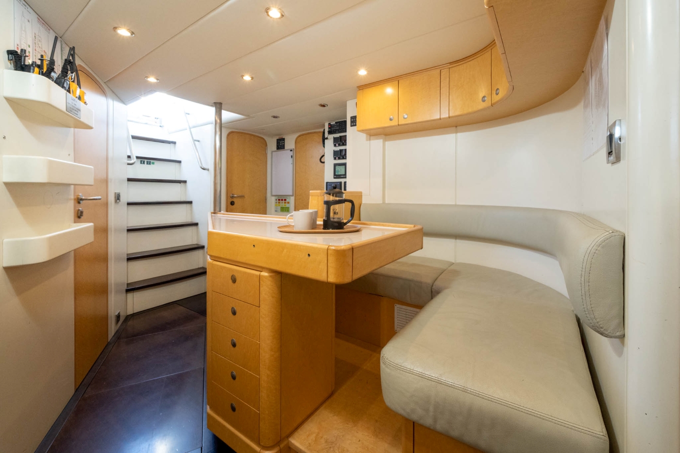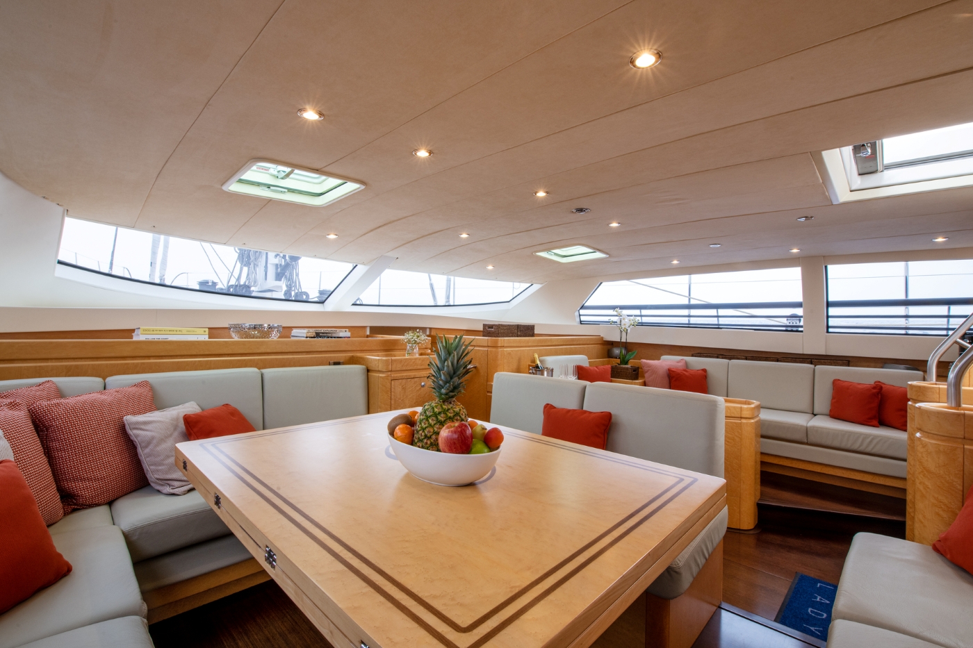 S/Y LADY 8's traditional dark blue hull blends the classic lines of renowned naval architect Phillippe Briand with the serenely modern pale wood and white leather interior. Wrap-around ports fill the saloon with light with 2 meters (6' 6) headroom adding to the feeling of spaciousness. The large dining table is to port with leather seating on all four sides. The cocktail table and additional seating are to starboard.