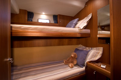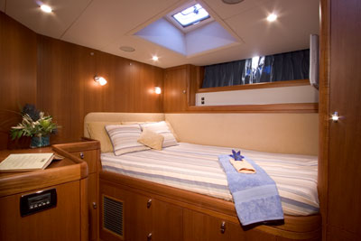 The guest accommodation is made up of a spacious aft cabin with a double berth and en-suite shower/head. A further two aft guest cabins offer a double berth to port and a bunk cabin to starboard with a shared shower/head. Each double has a TV allowing guests the use of their own DVD from the main system, alternatively you can listen to music on your iPod using the yachts’ iPod interface. The cabins are spacious and have maximum storage and locker space.