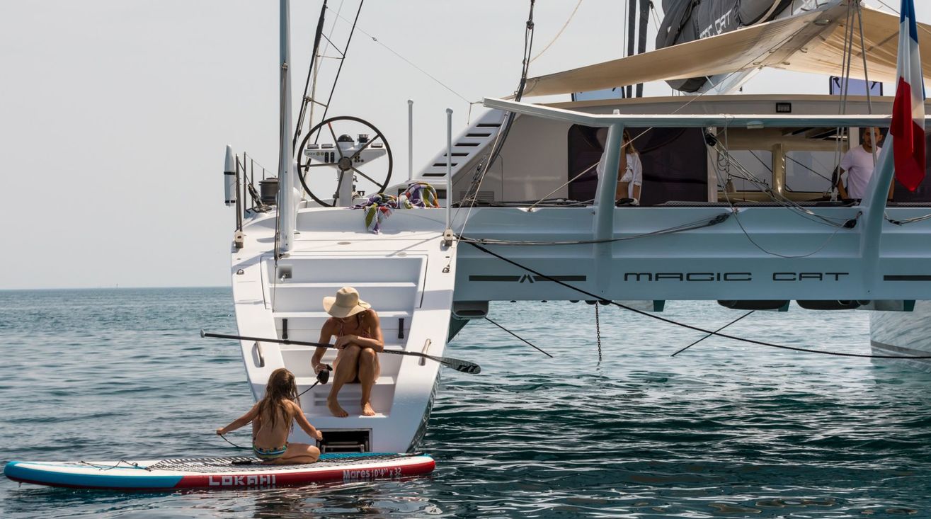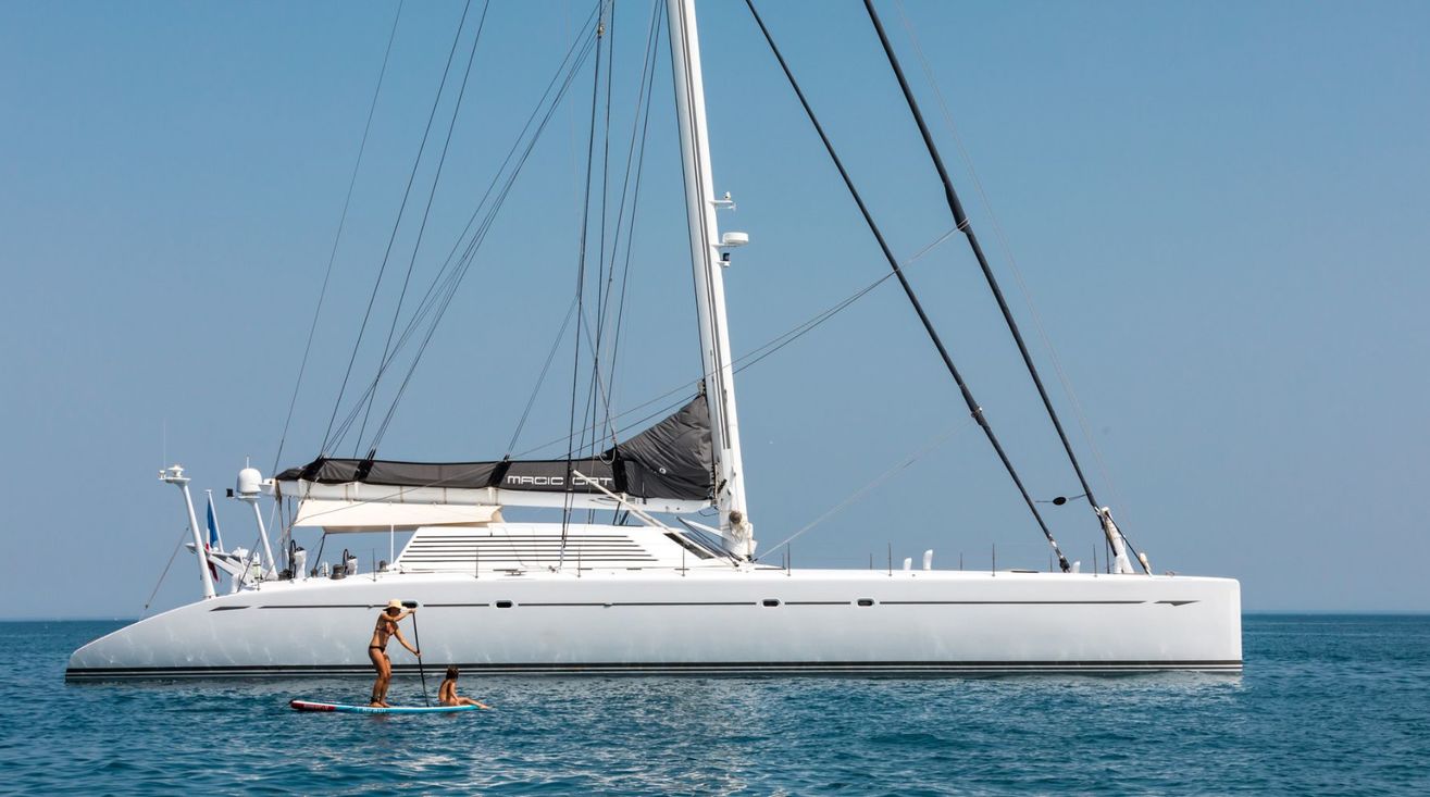 Sailing Catamaran MAGIC CAT is 82ft and was designed according to the very specific needs of a yacht for both private and owner’s use. MAGIC CAT was constructed in exactly the same way as a custom racing yacht and is built from carbon fibre with a spreader-less carbon fibre wing mast.