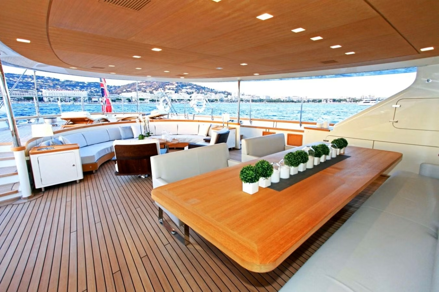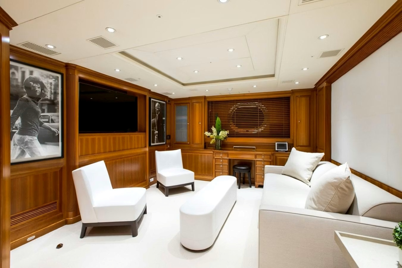The area below decks forward is dedicated to service facilities, quarters and mess for her crew of nine. The engineer's control room adjoins the main engine room to the aft of the yacht. Further aft is where the watersports equipment is stowed which includes a treadmill and a Laser dinghy. The hydraulic door doubles as swim platform or tender landing.