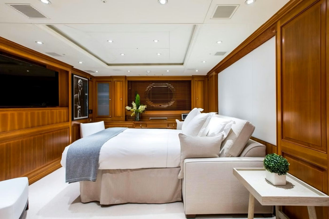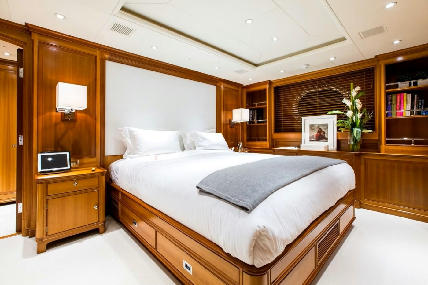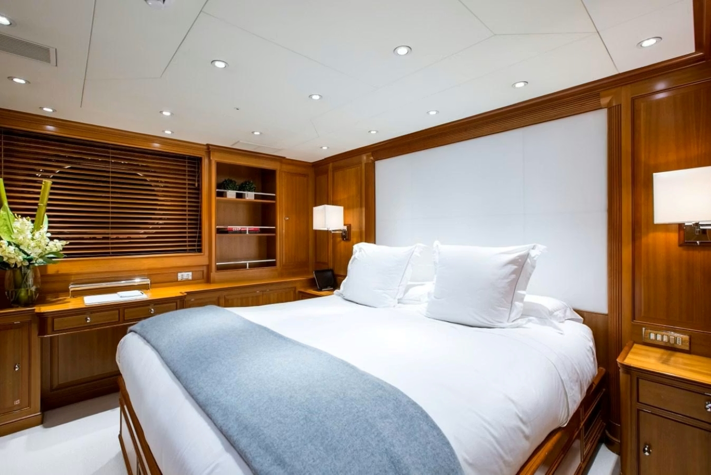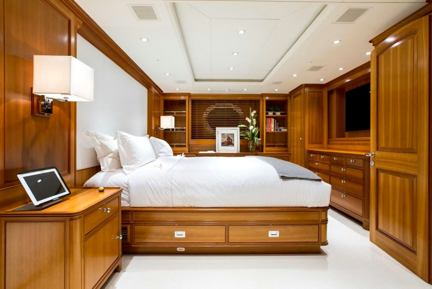 Sailing yacht PERSEUS can accommodate 10 guests in 5 cabins located below deck amidships, where motion is least and volume greatest. The full-beam master suite located just aft of amidships features a spacious double bedroom and study, two large bathrooms, and a wide dressing room. The cabin layout includes a king-size berth to the port side, spacious hanging lockers and open access to the owners sitting room to starboard which can convert to a children's cabin or additional guest stateroom if required. Both the stateroom and the sitting room have large plasma screens hidden behind electrically operated cherry panels, each with an independent sound system. There are two twin berth cabins on the port side of the yacht each with a Pullman bunks, both with ensuite head and stall showers and a Queen berth cabin with ensuite facilities located on the starboard side. All of the suites have large horizontal oval port lights, for added natural lighting and extended views.