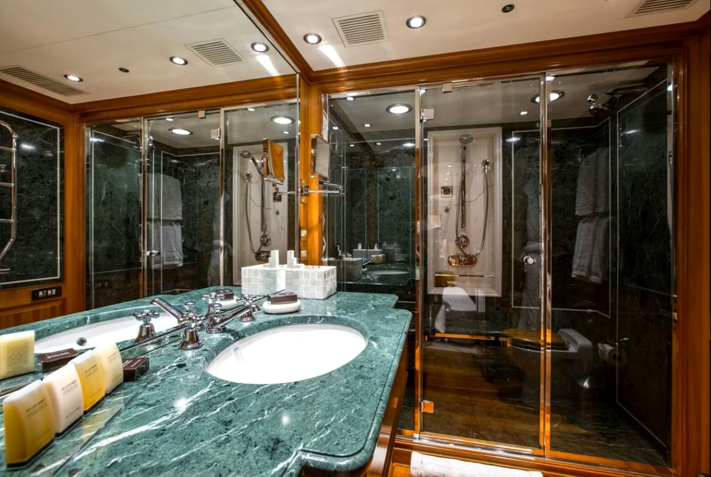 Luxury Perini Navi sailing yacht PERSEUS offers accommodation for up to 10-12 guests in flexible configurations consisting of 3 double and 2 twin Cabins with a Pullman each, preferably for young children due to the size of the berth. The office from the Master Suite can be separated to create the 5th cabin with a convertible double bed - this separated area has an ensuite shower room.