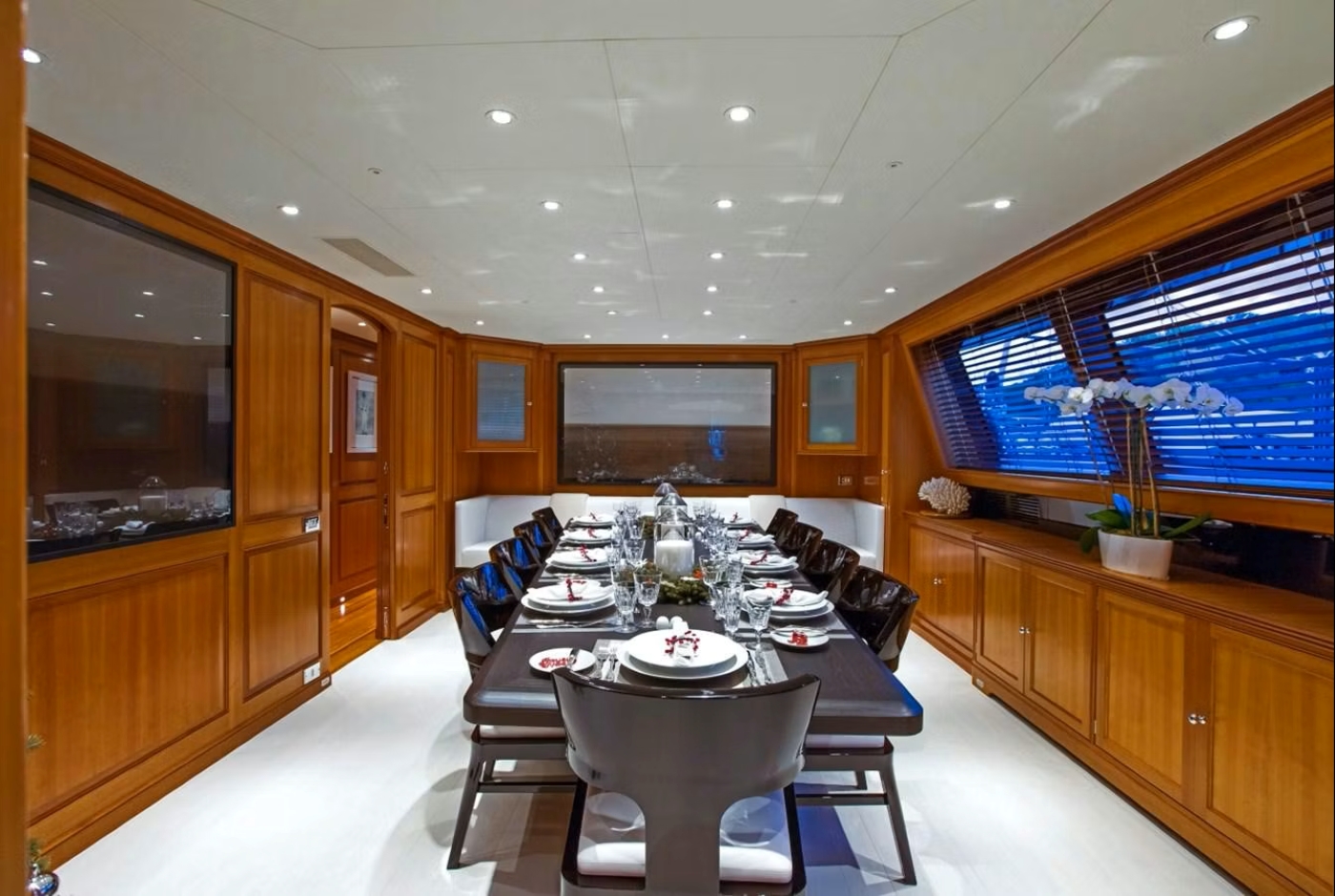 Yacht Silencio offers a generous formal dining salon comparable to that of a motor vessel. The yachts interior is enriched by fine joinery in cherry wood, increasingly popular for its warmth and lightness.