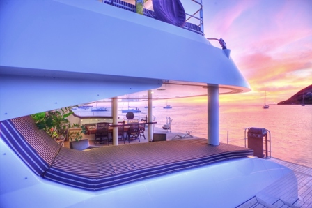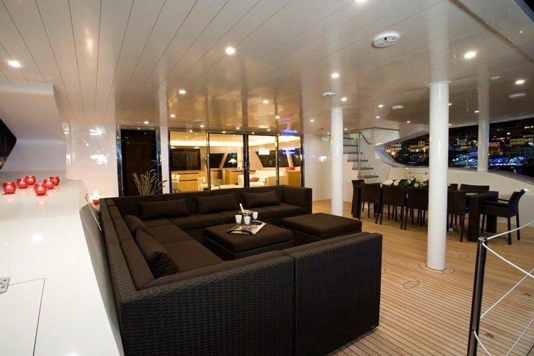The terrace also features a big private lounge. The aft stairs of each hull give direct access to the sea through a pivoting beach.