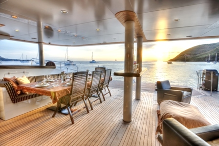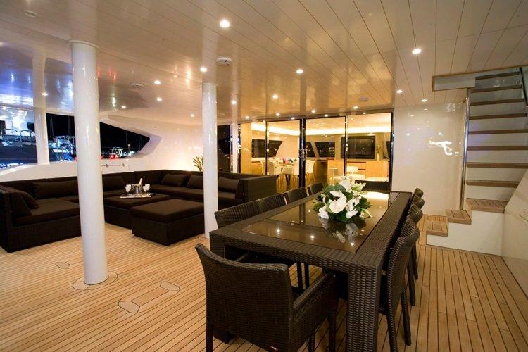 BLACK SWAN’s aft exterior saloon is a large shaded terrace with an unobstructed view forward and aft. An automatic sliding door integrates exterior settee with interior arrangement into a great social gathering area.