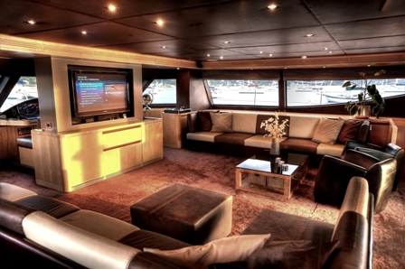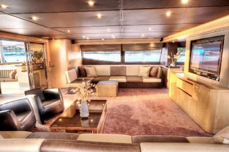 Access to the flybridge is made from aft terrace. The proposed layout shows sunbathing areas on each aft side of the fly with a comfortable central spa, a dining table with sofa.