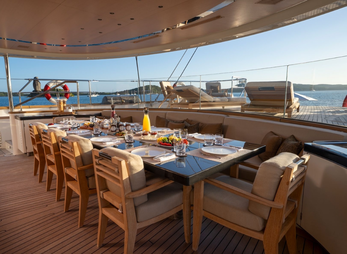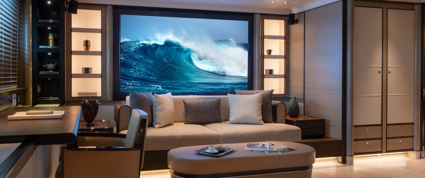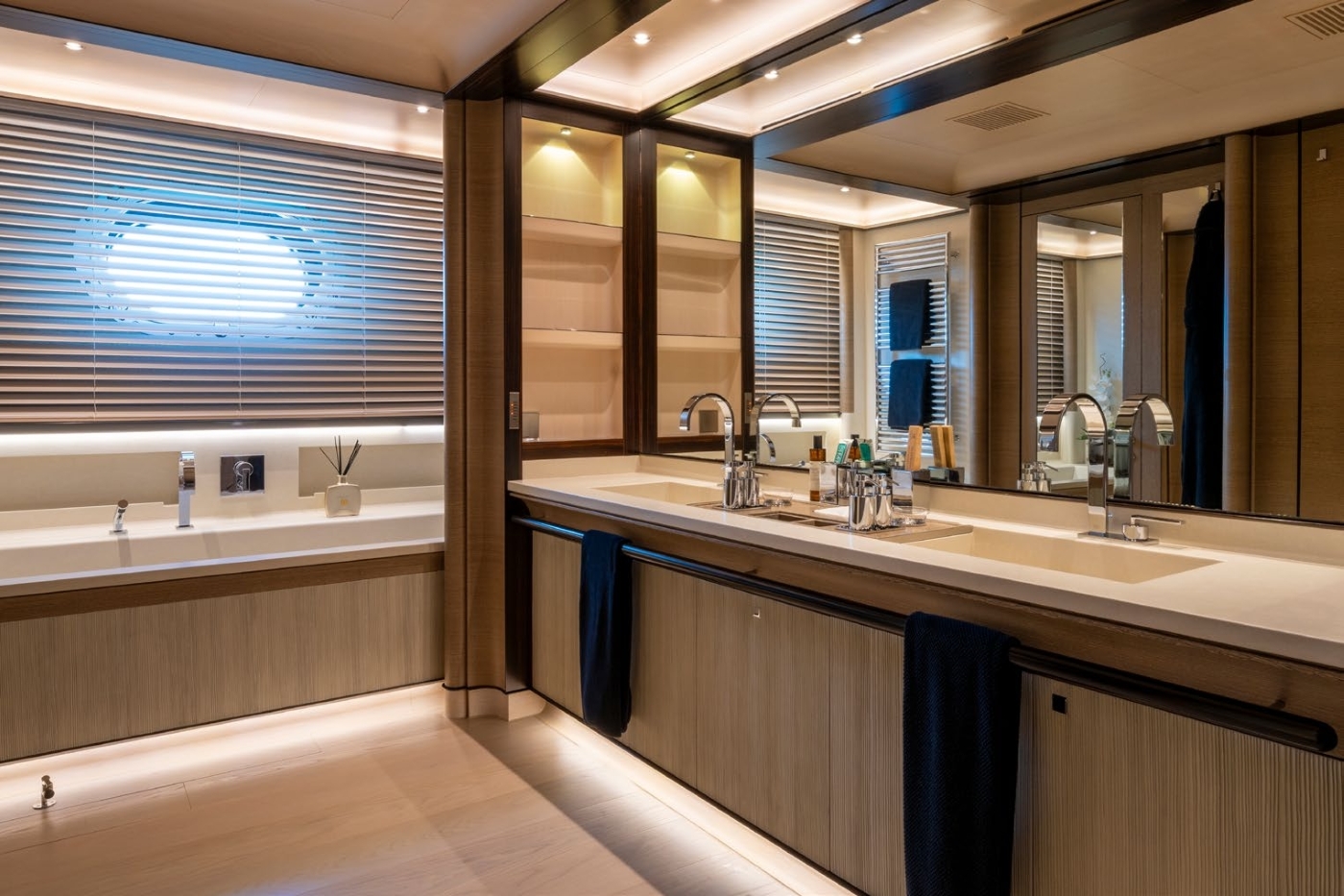 The very impressive interior of the yacht is from the design board of Remi Tessier. 'Elegant luxury' is the effect as blended with a natural and contemporary theme. This has been very successfully accomplished with the employment of a wide and rich variety of precious and refined materials. Interesting woods such as Macassar, ebony, wengè, teak - as well as complimentary texture created by leather - make for a natural and soothing feel.