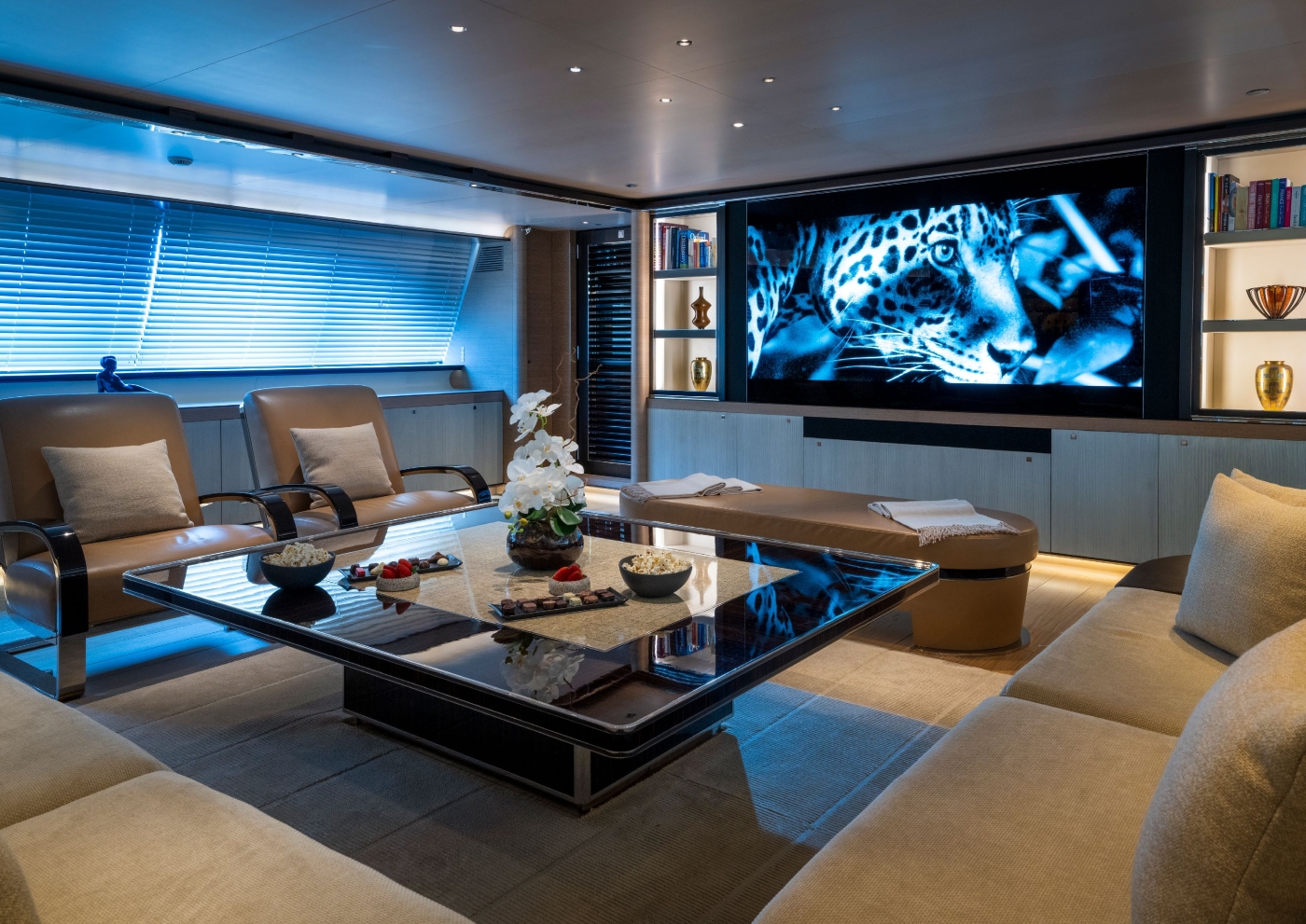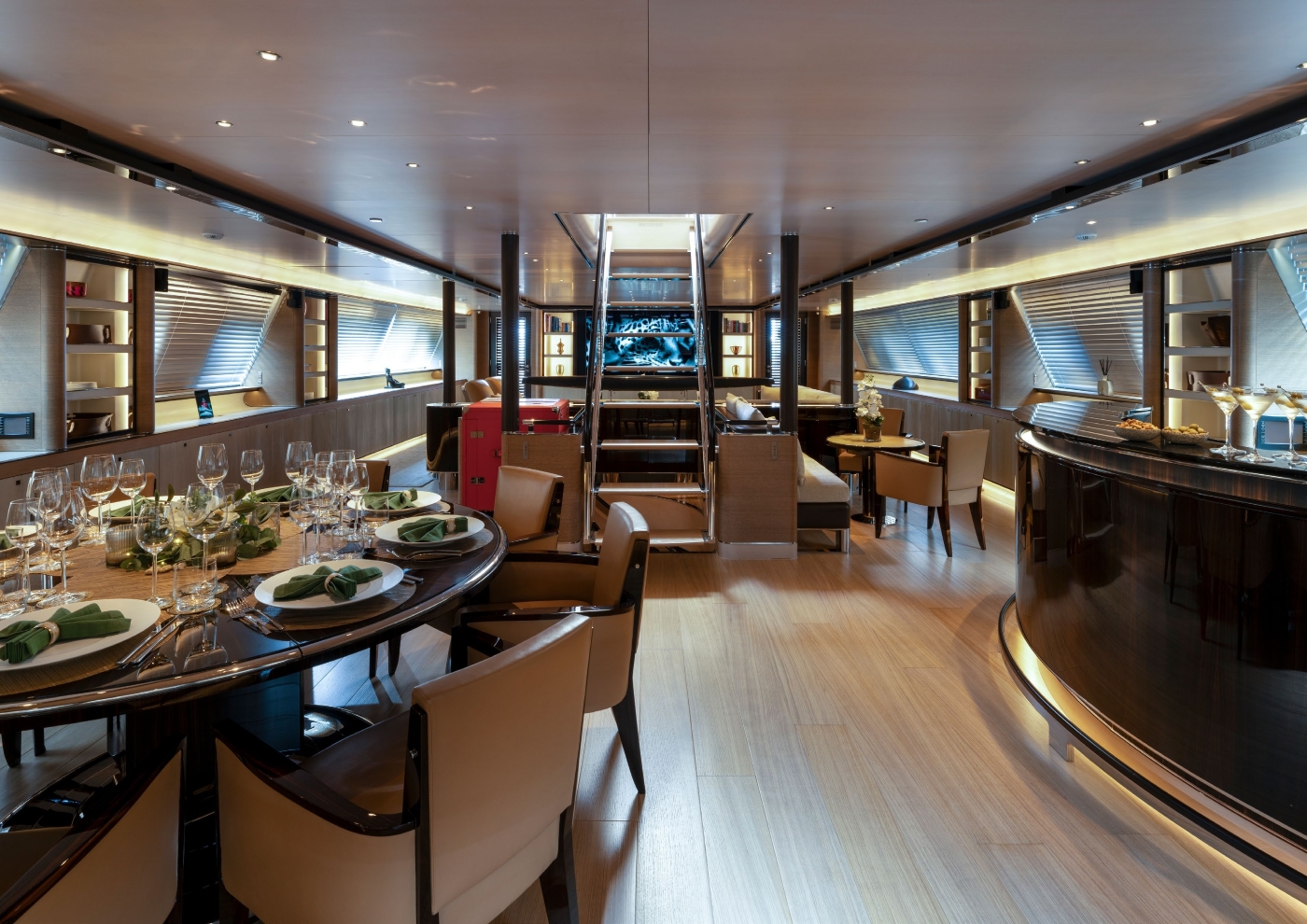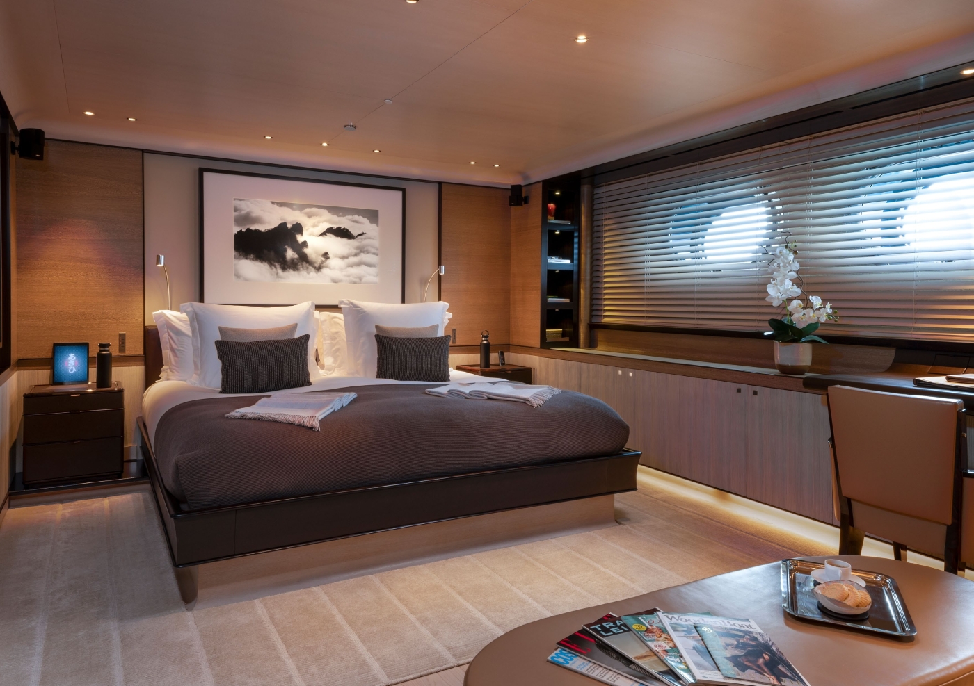 The very impressive interior of the yacht is from the design board of Remi Tessier. 'Elegant luxury' is the effect as blended with a natural and contemporary theme. This has been very successfully accomplished with the employment of a wide and rich variety of precious and refined materials. Interesting woods such as Macassar, ebony, wengè, teak - as well as complimentary texture created by leather - make for a natural and soothing feel.