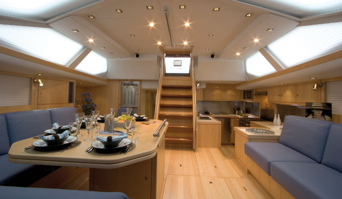Oyster 655 sailing yacht Roulette offers a stunning contemporary saloon area styled in Maple, with light blue leather upholstery and brushed stainless fixtures. Relax and enjoy the surround sound or plasma screen t.v whilst enjoying the comfort of the Air conditioning.