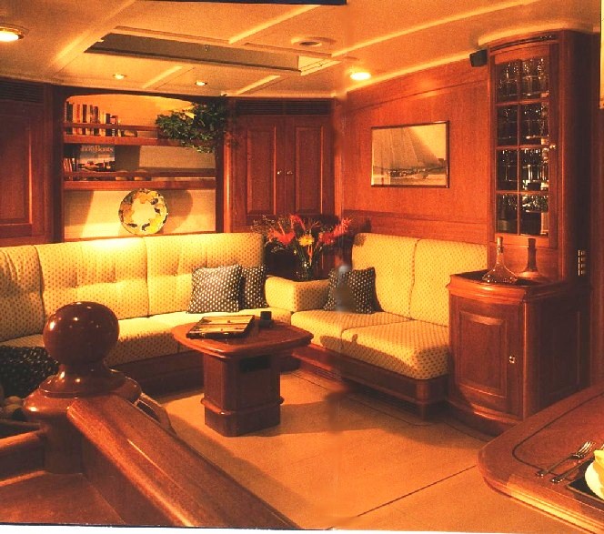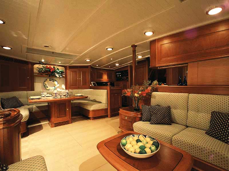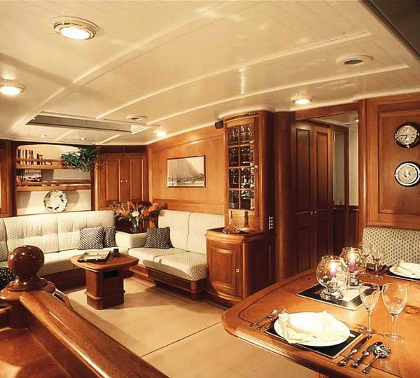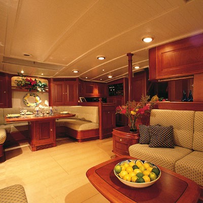 SEA DRAGON (ex SAPPHIRE) offers a contemporary yet deluxe interior with fine mahogany panels, maple floors and white deck heads. Many overhead hatches provide natural light and enhance the elegant ambience. The upper salon space is raised to just below deck level and features a formal dining area and ample seating, the views from the space are idyllic. Further forward and below decks, the main salon boasts a further dining table, plenty of seating and indoor entertainment.