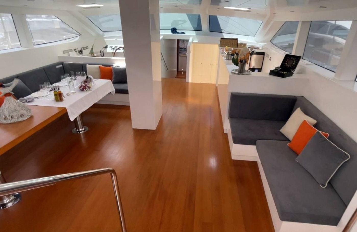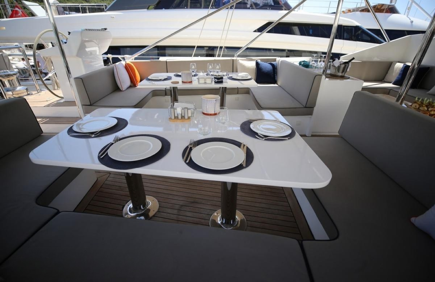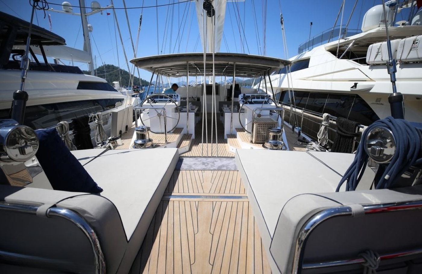 The fixed aft deck canopy is allowing the huge aft deck to be fully shaded so that guests can enjoy the light sea breeze and relax after exploring the best yacht charter locations.