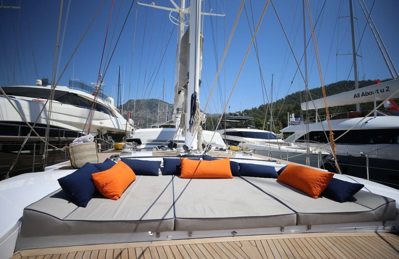 This sailing yacht has an excellent deck layout boasting two large sofas, dining tables, a wet bar and traditional sundeck lounging areas.