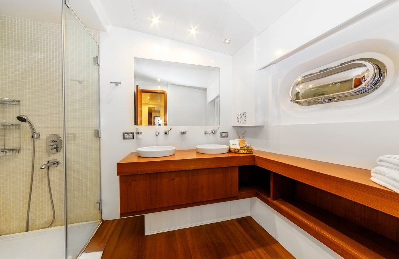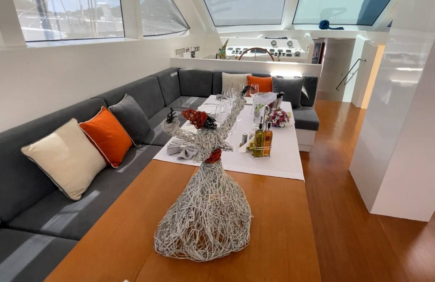 The lounge features a bar, library, TV, home theatre system, an audio corner and an inside steering station. There are TV and DVD players in each cabin, and the saloon and aft deck are equipped with a surround system and Hifi sets. There is a full TV reception through satellite.