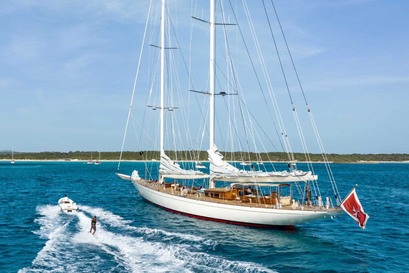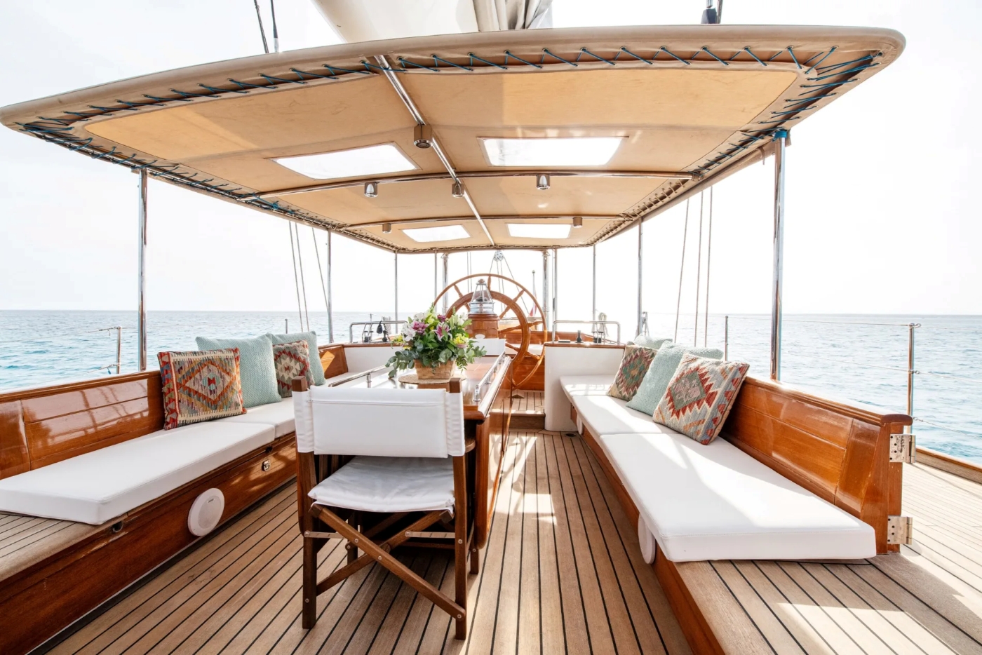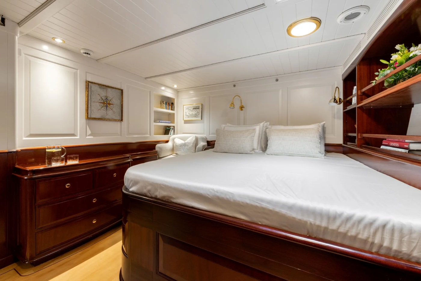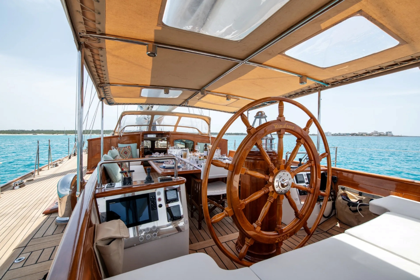 Yacht WINDROSE sports a long sleek classic hull and modern schooner rig designed to perform under sail and win races. The interior of sail yacht WINDROSE however was created to offer charter guests the ultimate comfort and class, boasting a handcrafted interior with solid-wood panelling and furniture, offset by cream ceilings and sophisticated lighting.