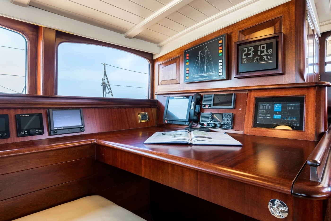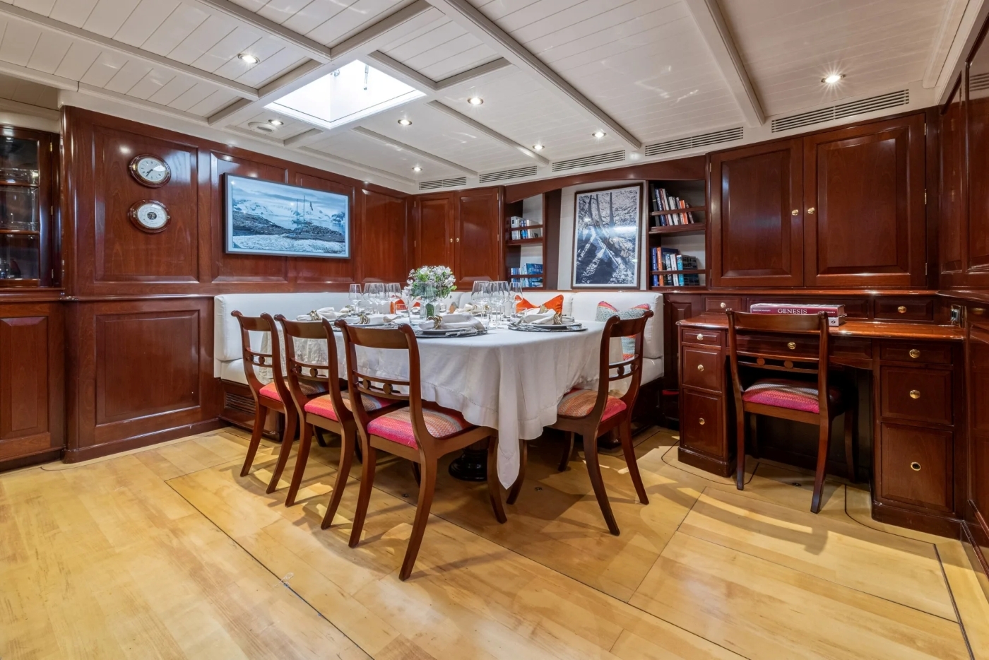 Luxury sailing yacht WINDROSE features a spacious main saloon with a seating area to port and a dining to starboard as well as a pilothouse saloon with a table for dinning or watch the view while under sail.